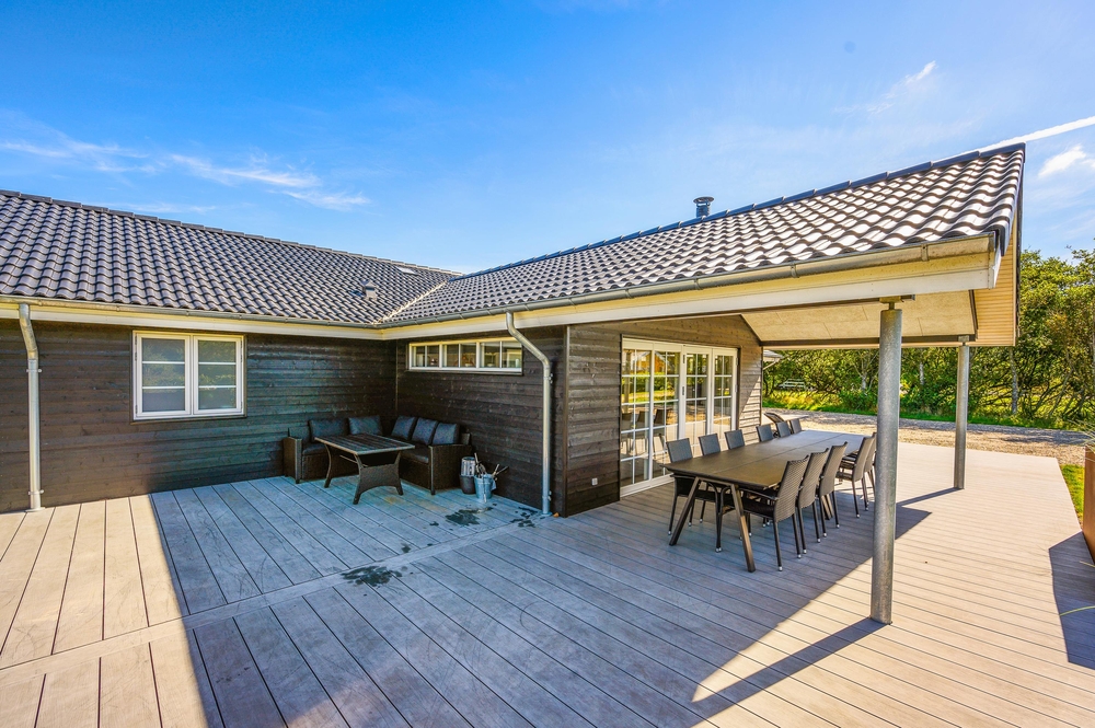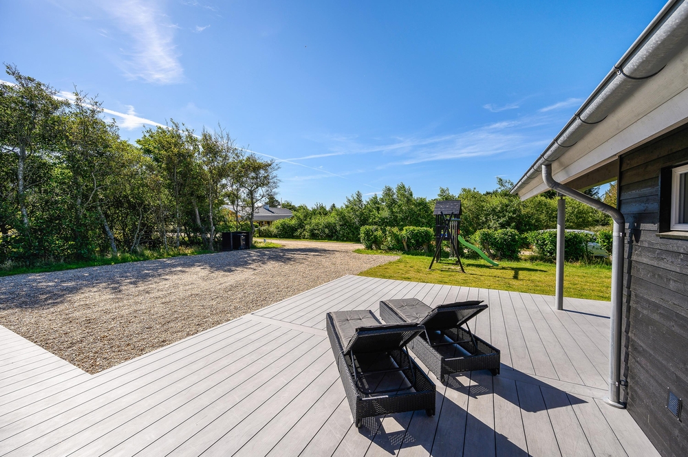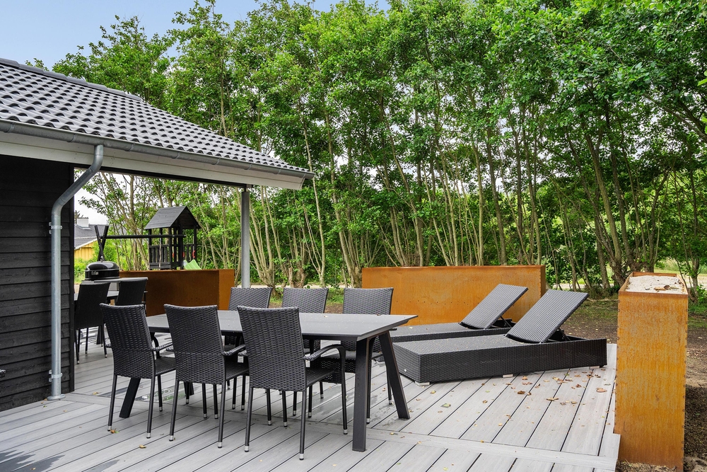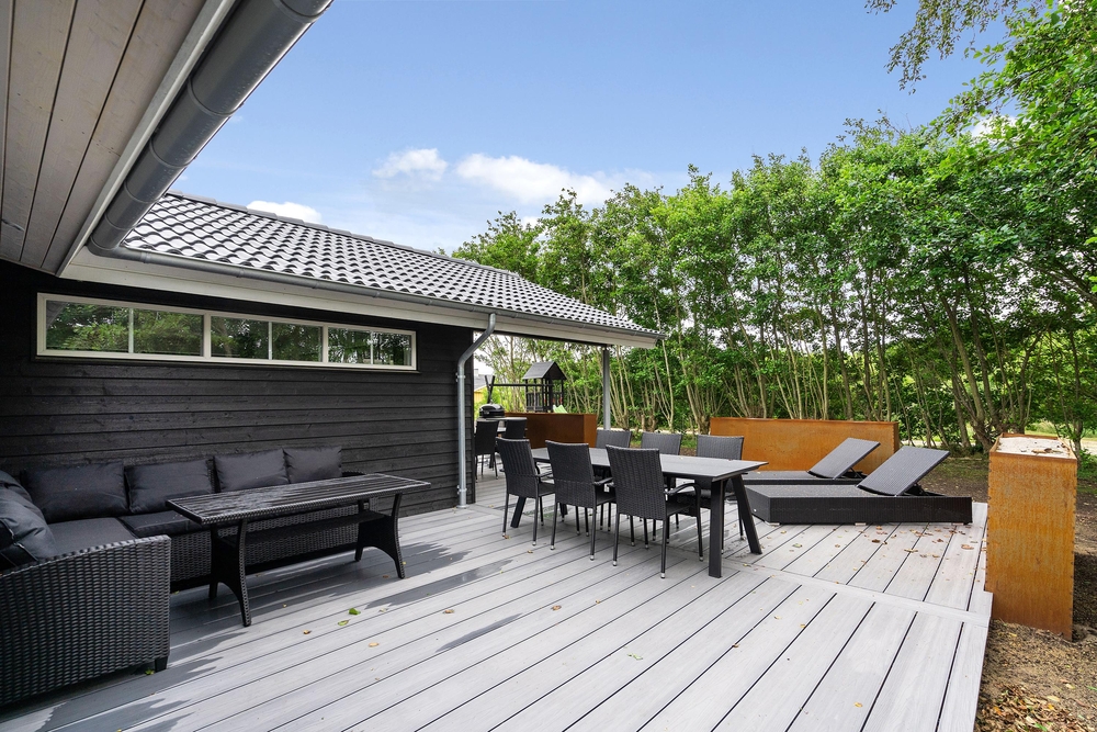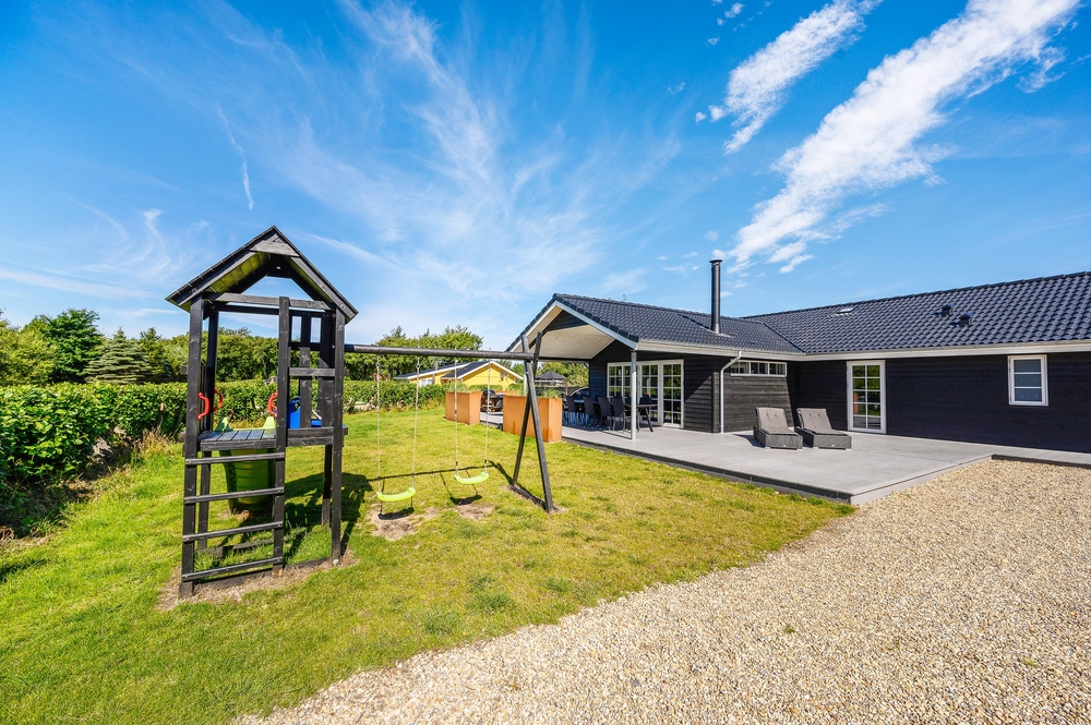 Feriehuset har en rigtig god terrasse, der både er åben og har en overdækket del, så I kan nyde den friske luft i al slags vejr. Der er havemøbler nok til alle, samt et par gode liggestole, og ikke mindst en stor grill, så I kan udnytte de skønne sommerdage til fulde og runde af med en god middag i aftensolen. Der er gyngestativ på grunden.