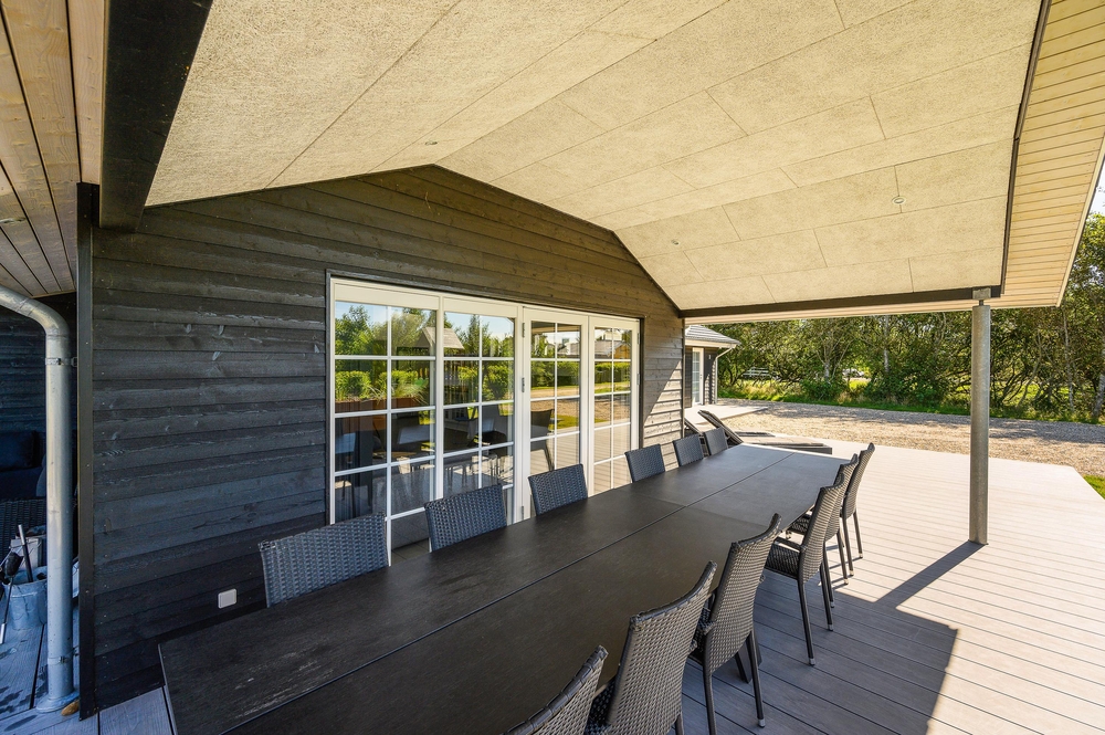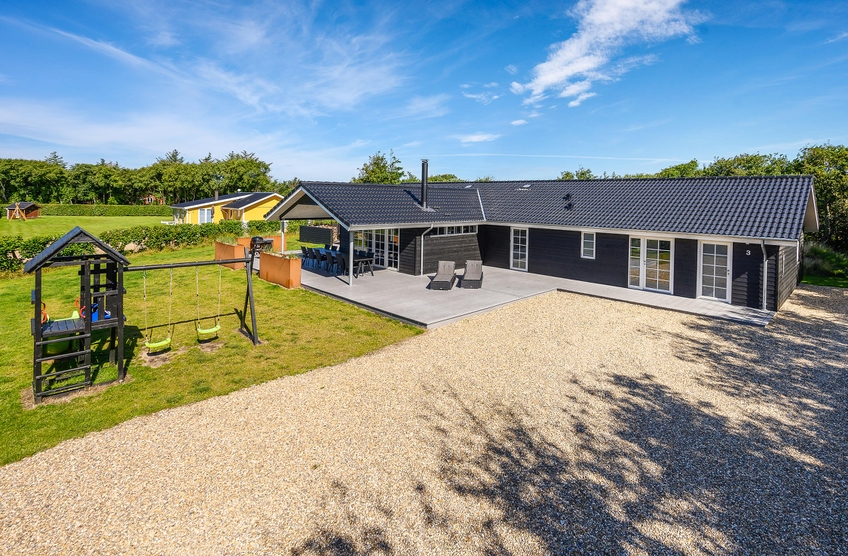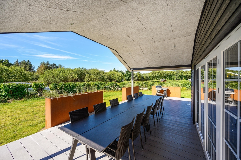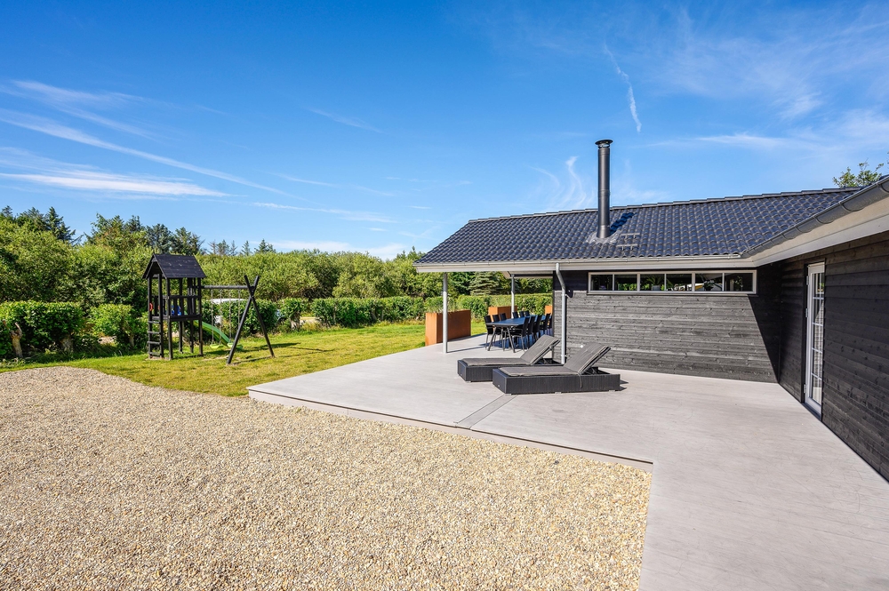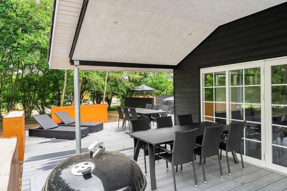Feriehuset har en rigtig god terrasse, der både er åben og har en overdækket del, så I kan nyde den friske luft i al slags vejr. Der er havemøbler nok til alle, samt et par gode liggestole, og ikke mindst en stor grill, så I kan udnytte de skønne sommerdage til fulde og runde af med en god middag i aftensolen. Der er gyngestativ på grunden.