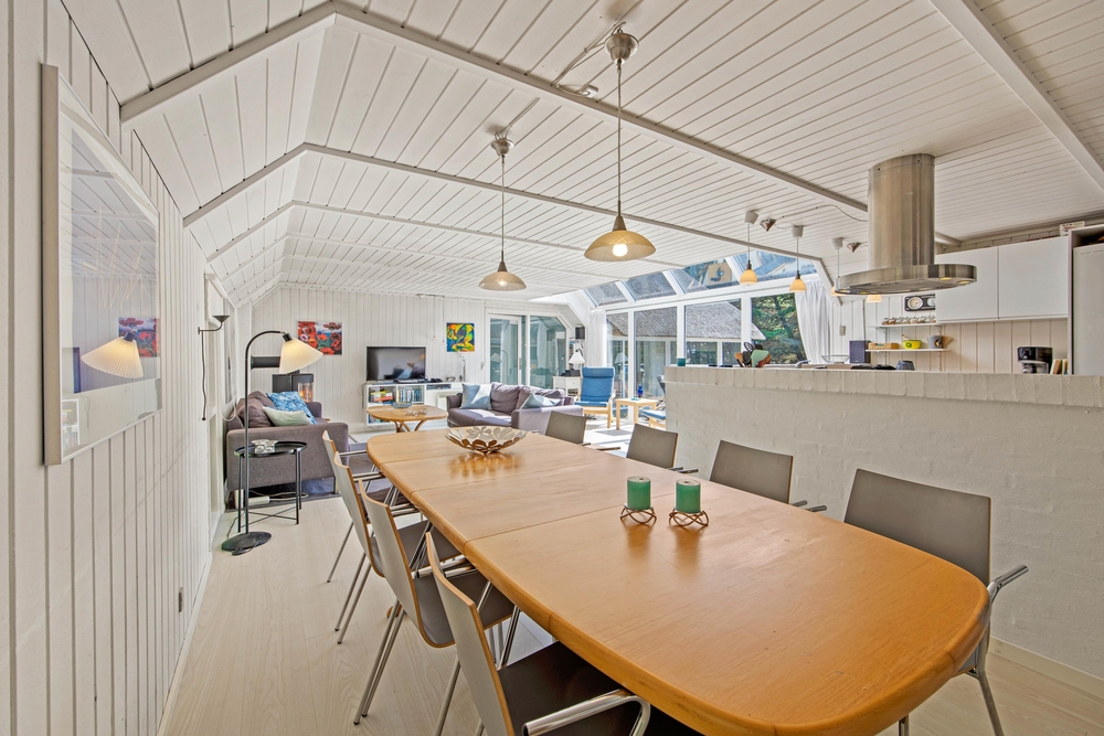 Spisestue og stuen med det dejlige lysindfald ligger i forlængelse af hinanden, og på den måde kan I være sammen hver for sig. Nogle vil måske gerne spille spil ved det store spisebord, mens andre vil hygge sig i sofaerne med en underholdende film eller en god bog ved brændeovnens hyggelige varme.