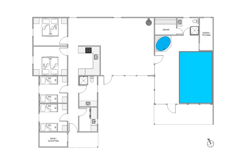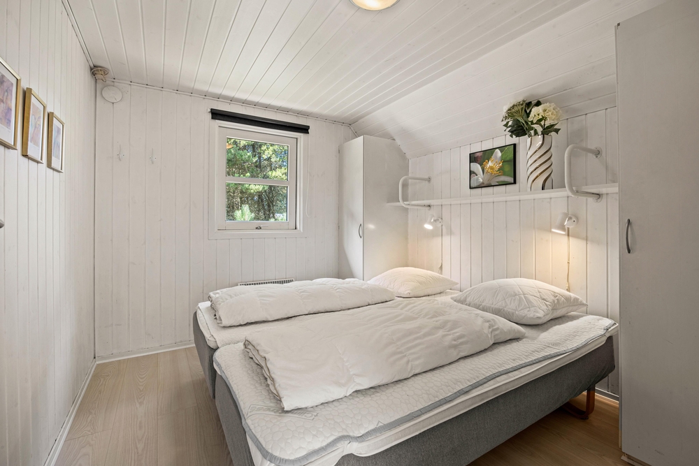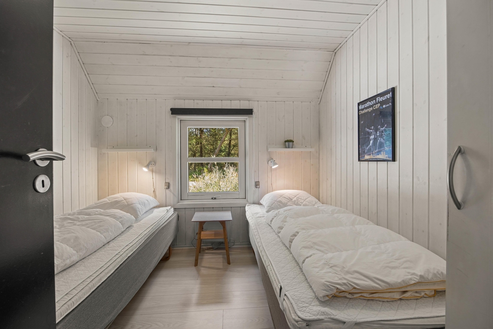 Feriehuset har 4 soveværelser ? 2 med dobbeltsenge og 2 med enkeltsenge ? og på hvert værelse er der 2 skabe, så I har plads til jeres tøj og sager. Derudover er der også 2 badeværelser med gulvvarme. Det ene ligger på værelsesgangen, og det andet ligger i forbindelse med poolrummet ved siden af saunaen.