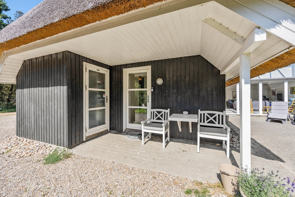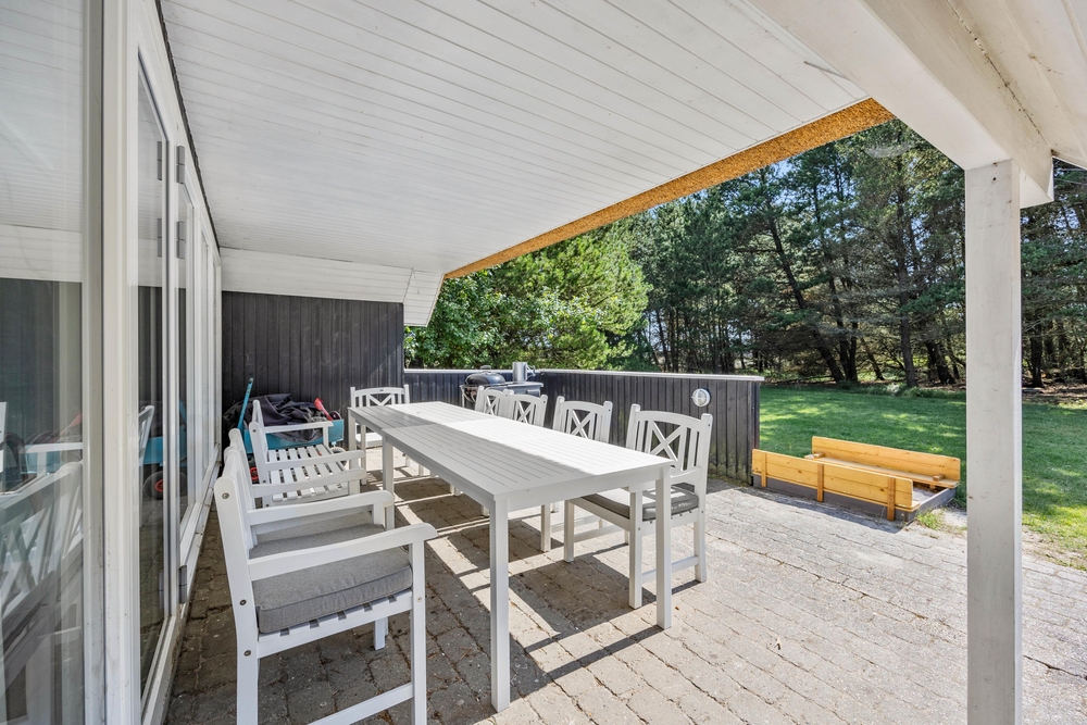 Der er dejligt læ på den 2915 m2 store grund, da de omkringliggende træer skærmer for vestenvinden og giver god mulighed for at nyde udelivet. Feriehuset har flere terrasser, så I har mulighed for at følge solen rundt eller finde skygge. Liggestolene står klar til jer, ligesom gasgrillen kun venter på jeres grillmad.