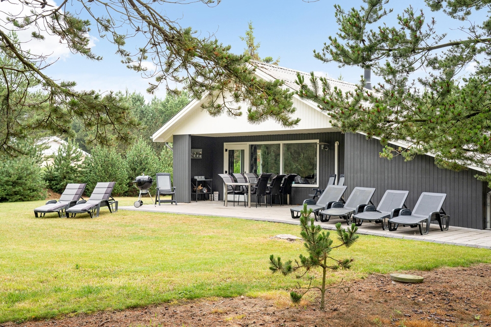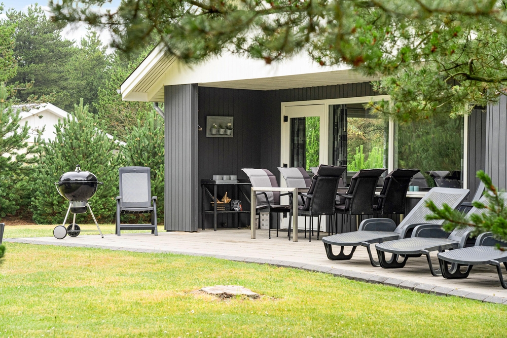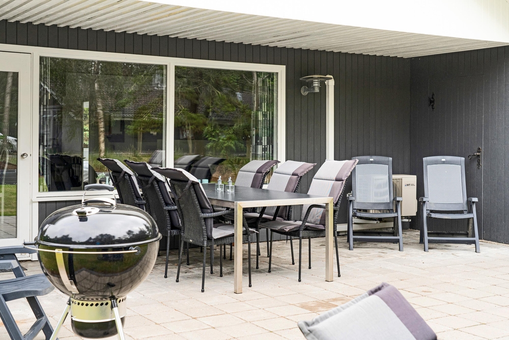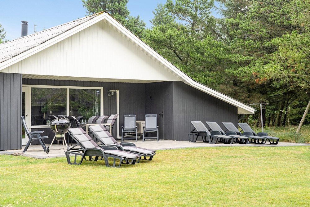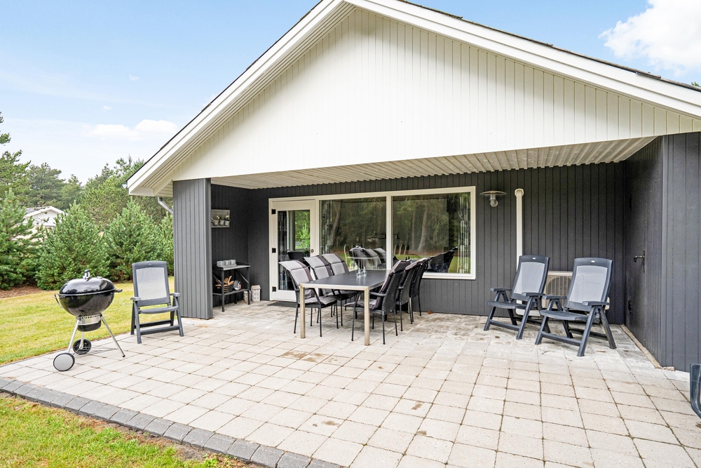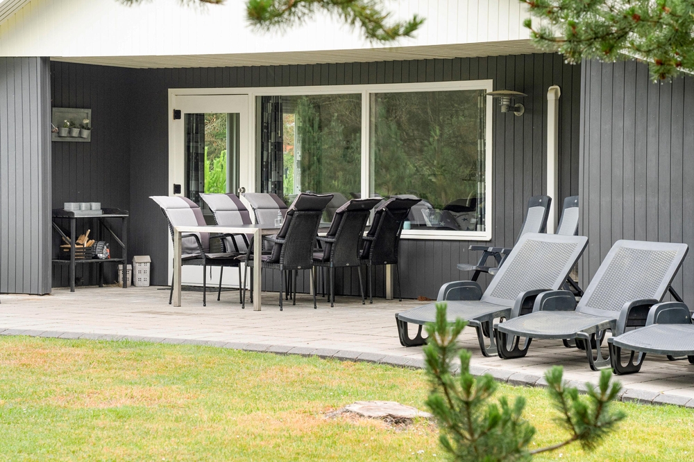 En stor terrasse går næsten hele vejen rundt om huset, og her er der masser af plads til at solbade og nyde feriefreden. Der er havemøbler og liggestole nok til alle, og på de lune aftener kan I tænde op i grillen.