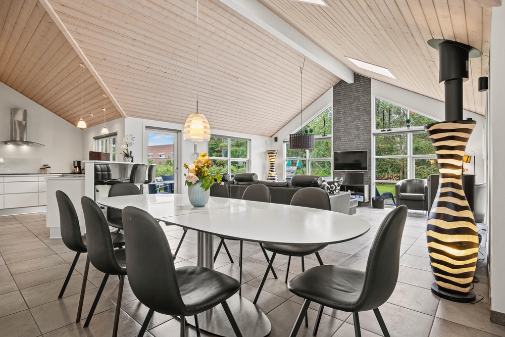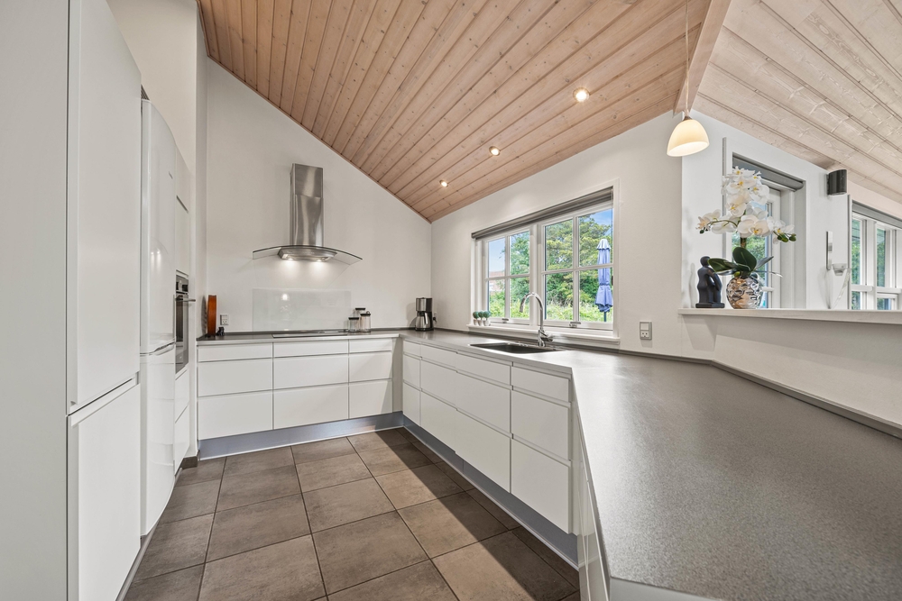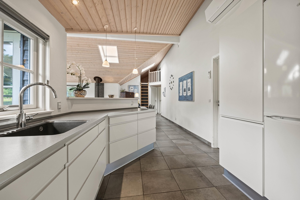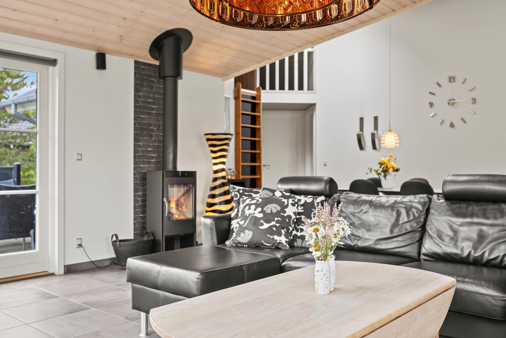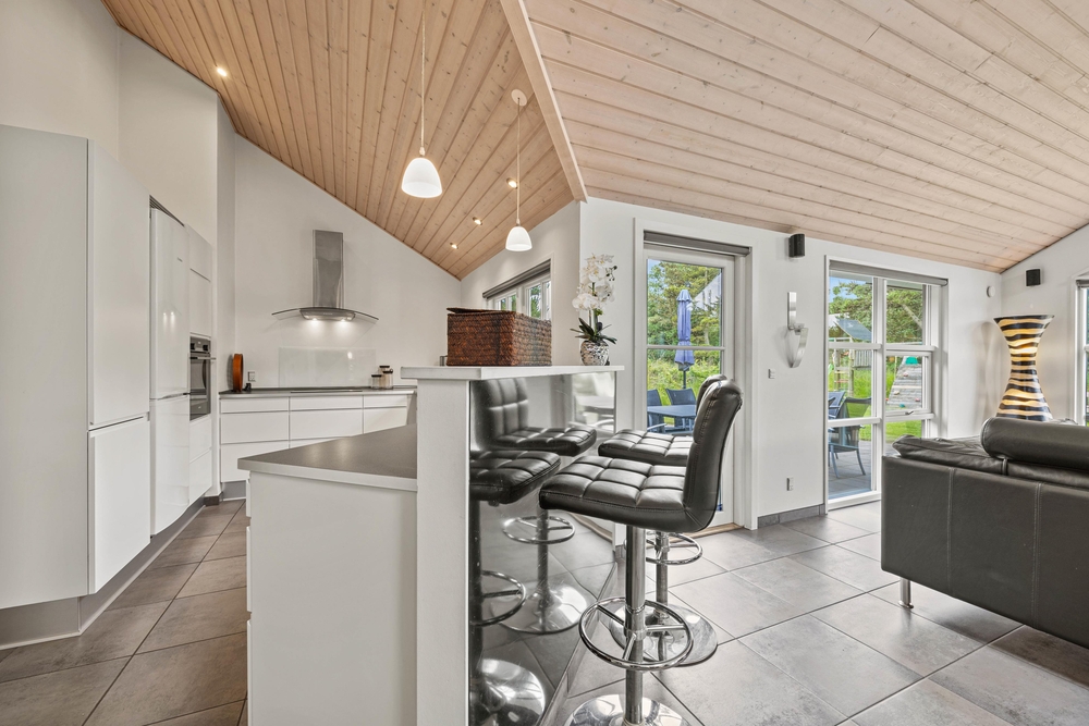 Indenfor er sommerhuset indrettet med et åbent funktionelt køkken, som ligger i åben forbindelse med spiseplads og stue. Indretningen er holdt i enkelte nuancer og gennem de store smukke vinduer strømmer lyset ind. Her kan der læses, spilles, strikkes og meget mere, mens ilden knitrer i brændeovnen. I fjernsynet er et Chromecast, således I har mulighed for at streame, mens der laves lækker mad i køkkenet. Her er en fin siddeplads, hvor man kan hyggesnakke med feriekokken under madlavningen. I alrummet er der desuden gulvvarme samt en stige til hemsen.