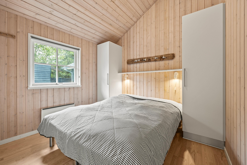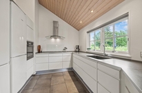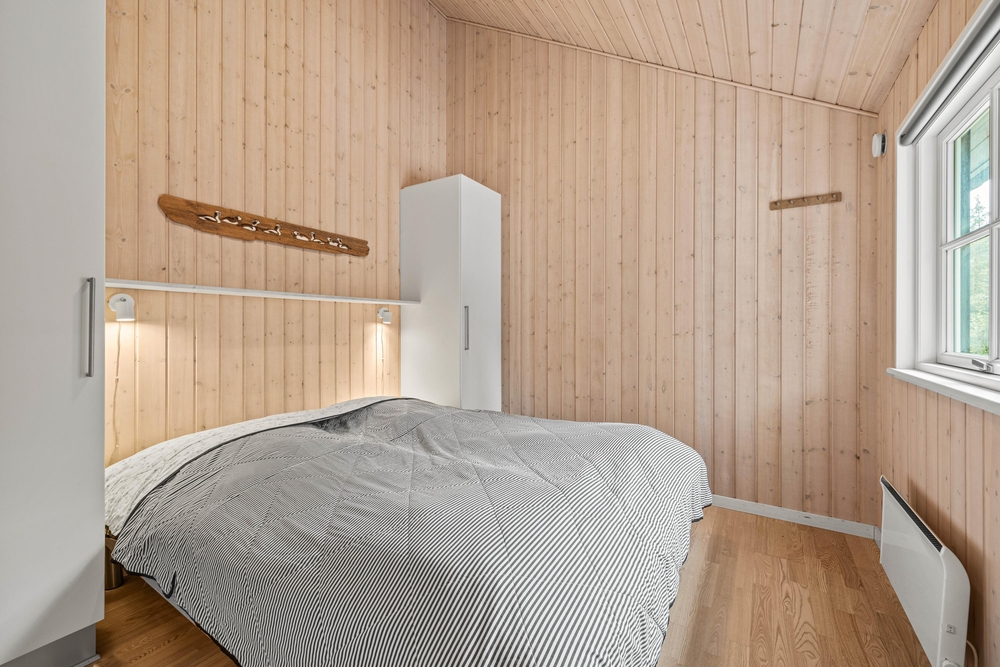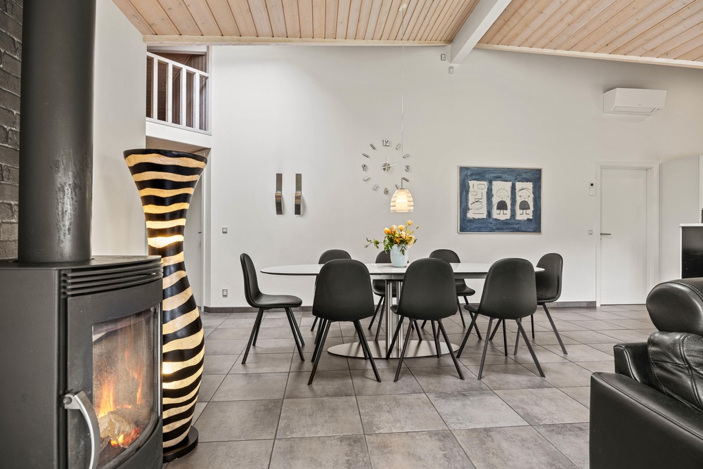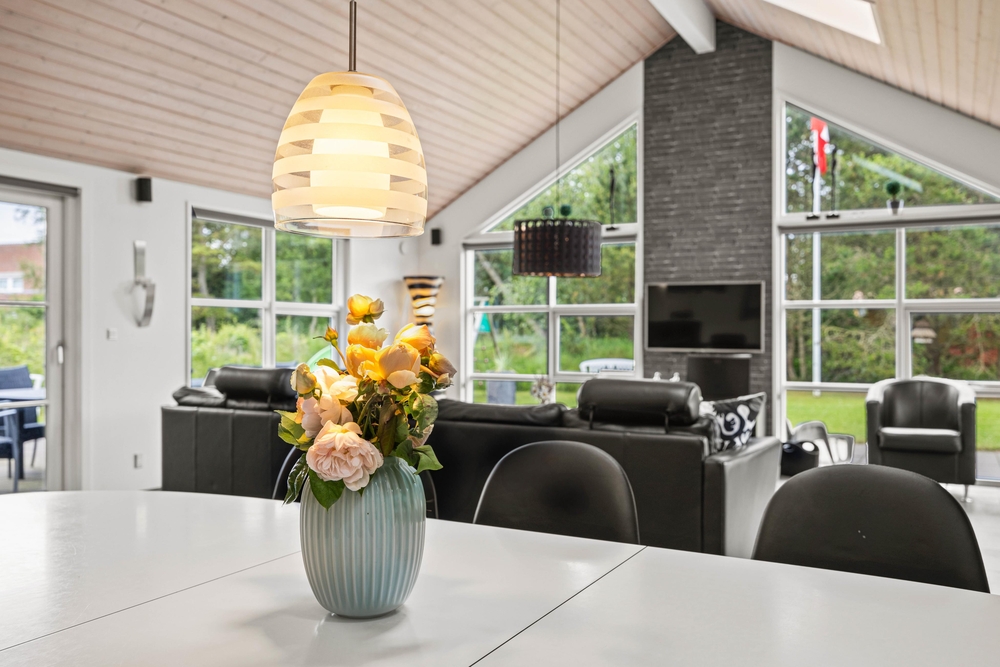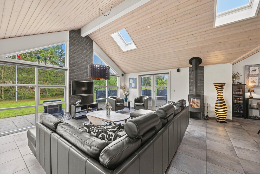 Indenfor er sommerhuset indrettet med et åbent funktionelt køkken, som ligger i åben forbindelse med spiseplads og stue. Indretningen er holdt i enkelte nuancer og gennem de store smukke vinduer strømmer lyset ind. Her kan der læses, spilles, strikkes og meget mere, mens ilden knitrer i brændeovnen. I fjernsynet er et Chromecast, således I har mulighed for at streame, mens der laves lækker mad i køkkenet. Her er en fin siddeplads, hvor man kan hyggesnakke med feriekokken under madlavningen. I alrummet er der desuden gulvvarme samt en stige til hemsen.