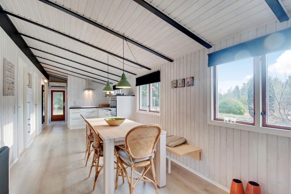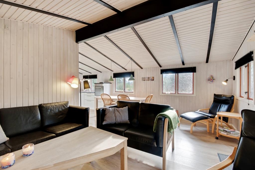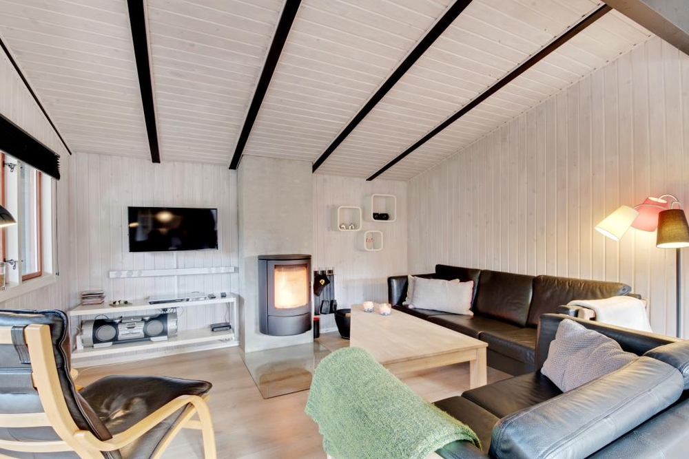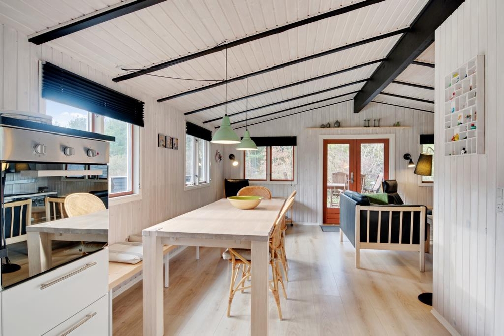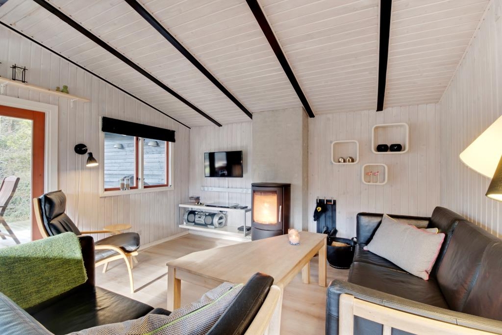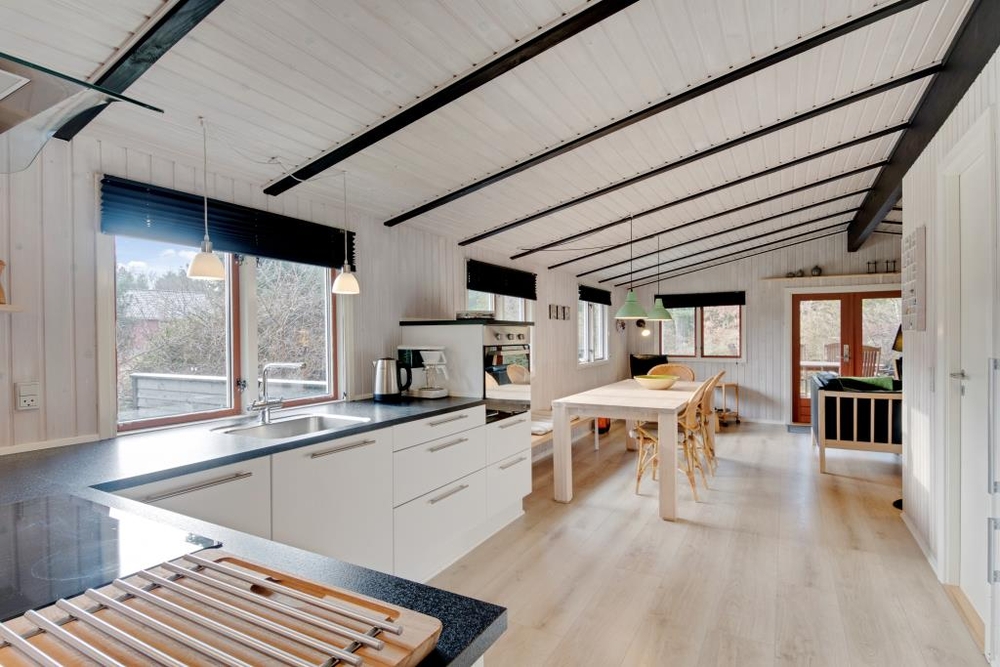 Den lyse stue med det åbne, veludstyrede køkken indbyder til masser af familietid. Den venlige og moderne indretning og de mørke loftsbjælker som kontrast på de lyse trælofter tilfører omgivelserne den helt klassiske sommerhuscharme. På de kølige dage kan I sætte jer til rette foran den knitrende brændeovn og varme jer på en kop kakao.