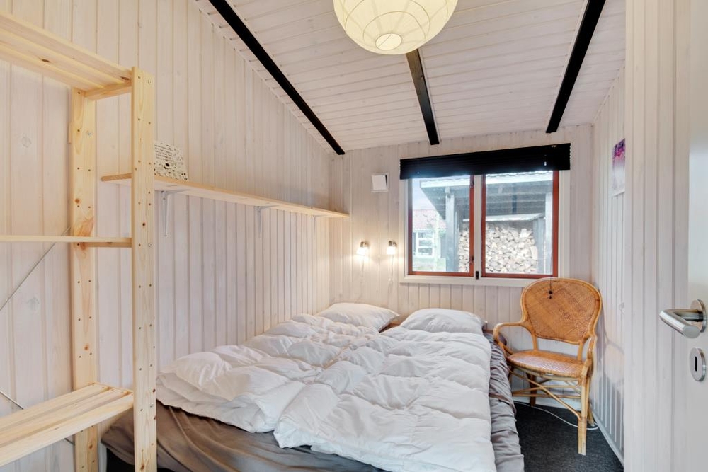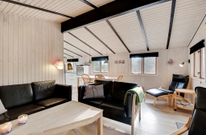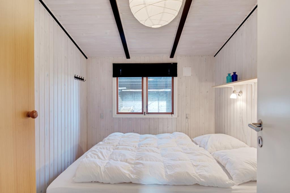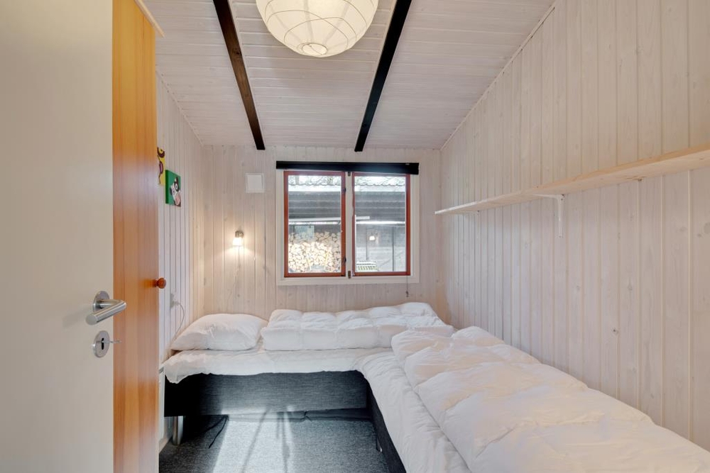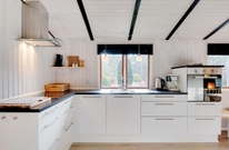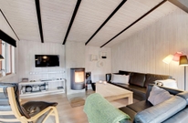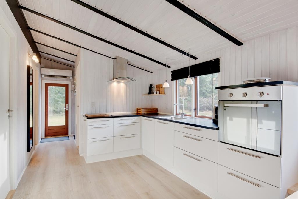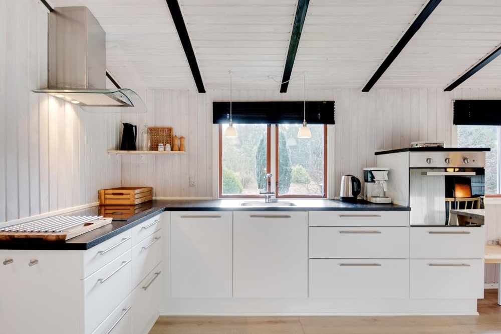 Den lyse stue med det åbne, veludstyrede køkken indbyder til masser af familietid. Den venlige og moderne indretning og de mørke loftsbjælker som kontrast på de lyse trælofter tilfører omgivelserne den helt klassiske sommerhuscharme. På de kølige dage kan I sætte jer til rette foran den knitrende brændeovn og varme jer på en kop kakao.