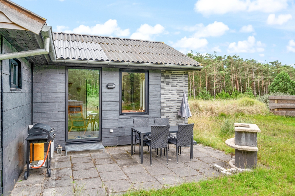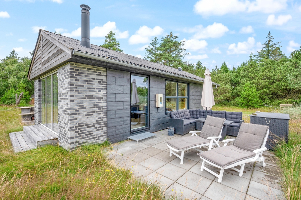 Sommerhusets terrasse er afskærmet, og her står der både havemøbler og liggestole klar til jer, så I kan sætte jer godt til rette på en god plads i solen.