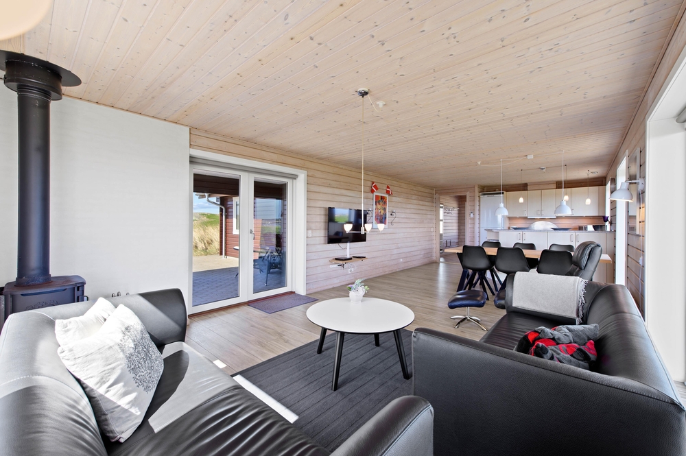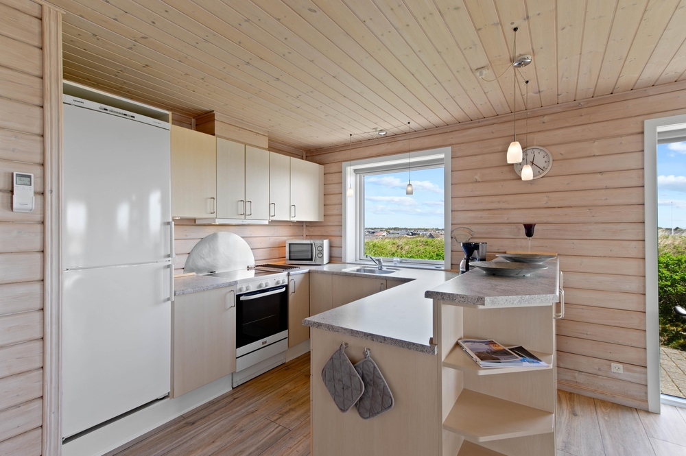 Køkkenet er pænt og praktisk indrettet og har opvaskemaskine, stor fryser og mikroovn. Køkkenet står i åben forbindelse med den nydelige stue, som er indrettet med brændeovn og komfortable møbler, så I kan slappe af efter en begivenhedsrig dag.