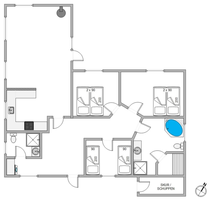Praktisk er her en udebruser (fra april til november), så I nemt kan komme til at skylle tæerne efter en lang dag ved Vesterhavet