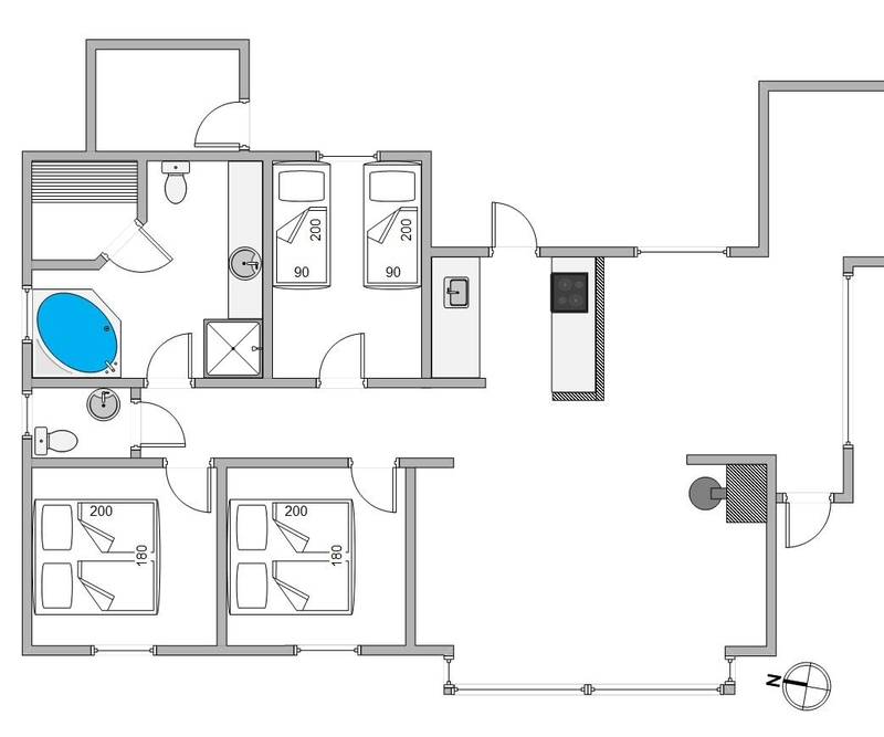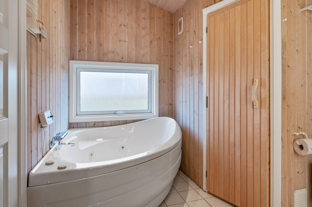 Både det store wellness-badeværelse med spa og sauna og det mindre gæstebadeværelse er forsynet med gulvvarme. Derudover er der både vaskemaskine og tørretumbler i sommerhuset.
