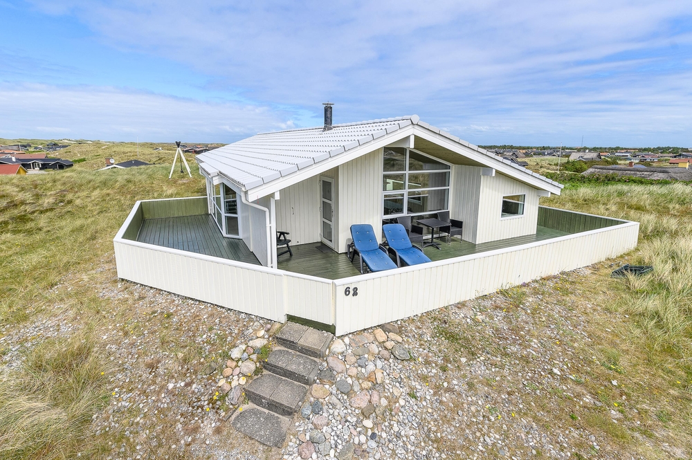 Et dejligt, velholdt feriehus med unik beliggenhed på den højstliggende grund i området finder I her på Rauhesvej 62 i Bjerregård. Her er en fantastisk panoramaudsigt over den smukke natur med hede og klitter. Herfra kan I se Nymindegab og Lønborg kirke. Sommerhuset er omgivet af en stor velafskærmet og helt lukket terrasse, hvor du altid kan finde en herlig lækrog, hvor du kan nyde vestkystens friske luft. Jeres hund er også hjertelig velkommen i feriehuset.