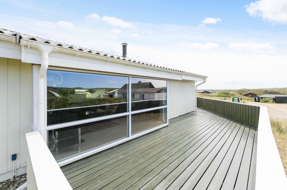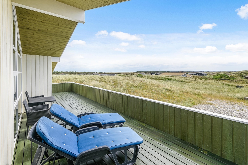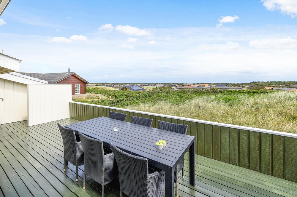 Fra den store afskærmede og velmøblerede terrasse er der en helt enestående udsigt over den storslåede natur med hedearealer og klitter. Her kan I altid finde en lækrog, hvor solen og den friske havluft kan nydes ganske ugeneret.