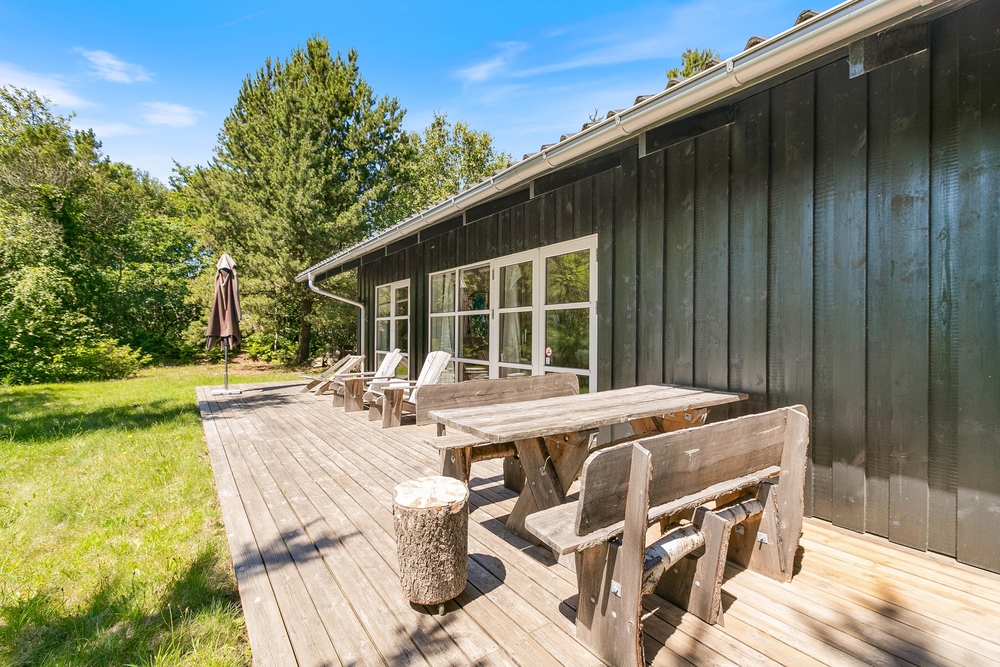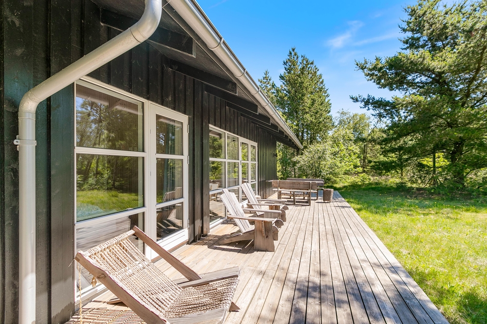 Feriehuset ligger omkranset af træer, der sørger for både læ og privatliv, så I uforstyrret kan nyde ferien på terrassen og ind i huset. Feriehuset har en dejlig, åben terrasse, hvor du kan sidde og nyde naturgrunden. Der er naturligvis havemøbler, liggestol og en grill, så I kan få det meste ud af solskinsdagene. På den imponerende 2250m2 store naturgrund kan I nyde roen og skønheden i de naturlige omgivelser og her er et dejligt grundstykke, hvor børn og barnlige sjæle vil kunne slå sig løs og lege på den store grund.