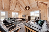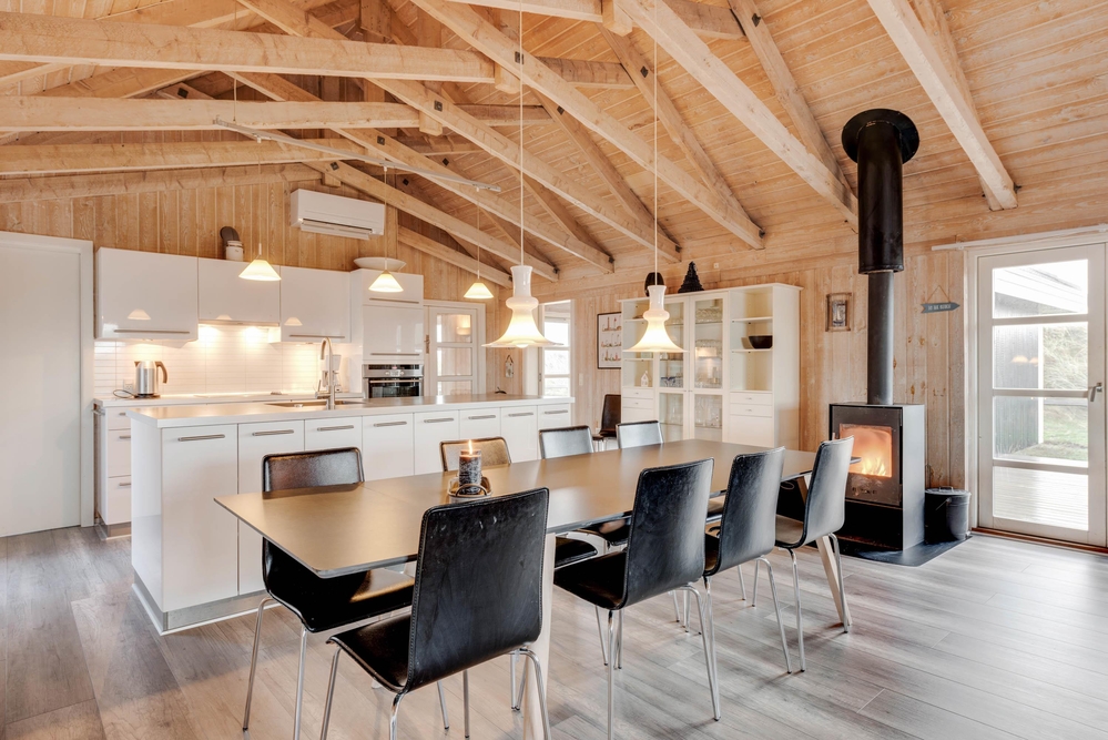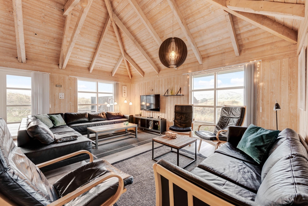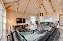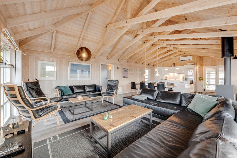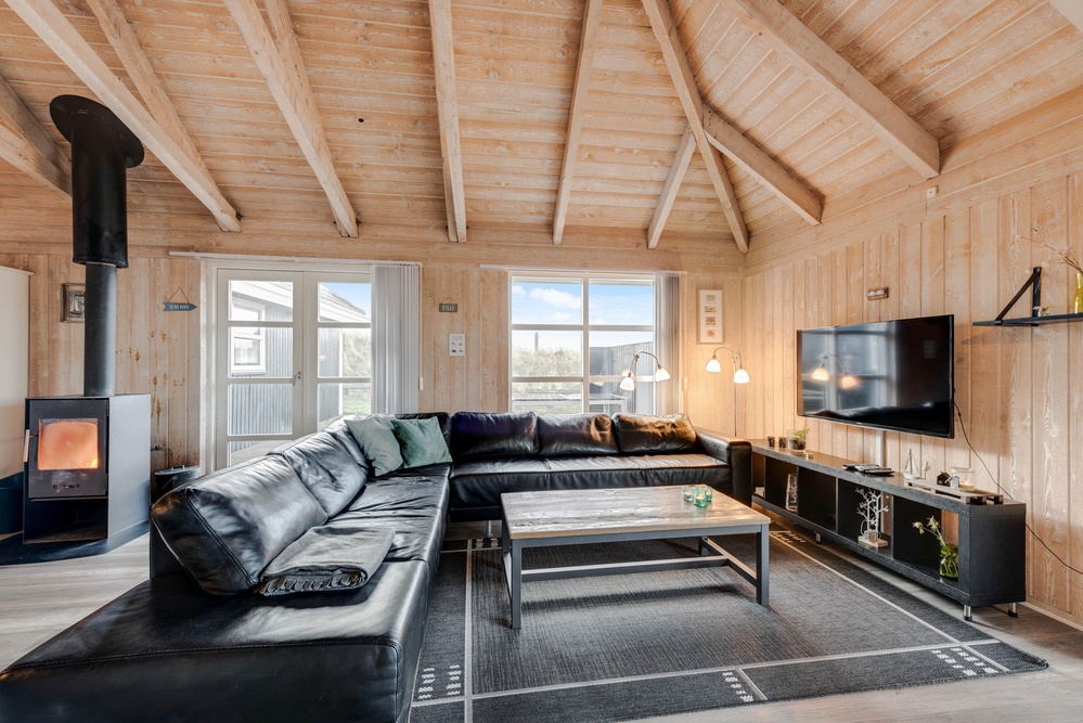 Opholdsrummet emmer af klassisk sommerhusstil med træfacader, synlige bjælker og åbent op i kip. Midt i rummet står brændeovnen, som spreder hygge og varme til hele rummet, mens de store vinduespartier bringer både lyset og naturen ?helt ind i stuen?. Sofagrupperne indbyder til hyggeligt samvær for alle, både med TV og diverse familiespil.