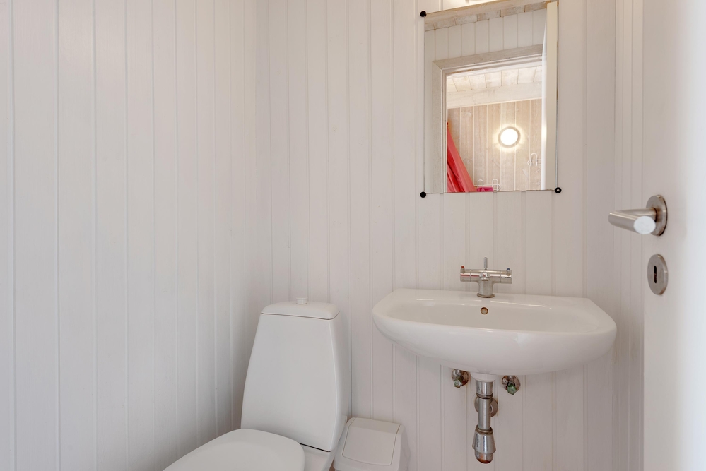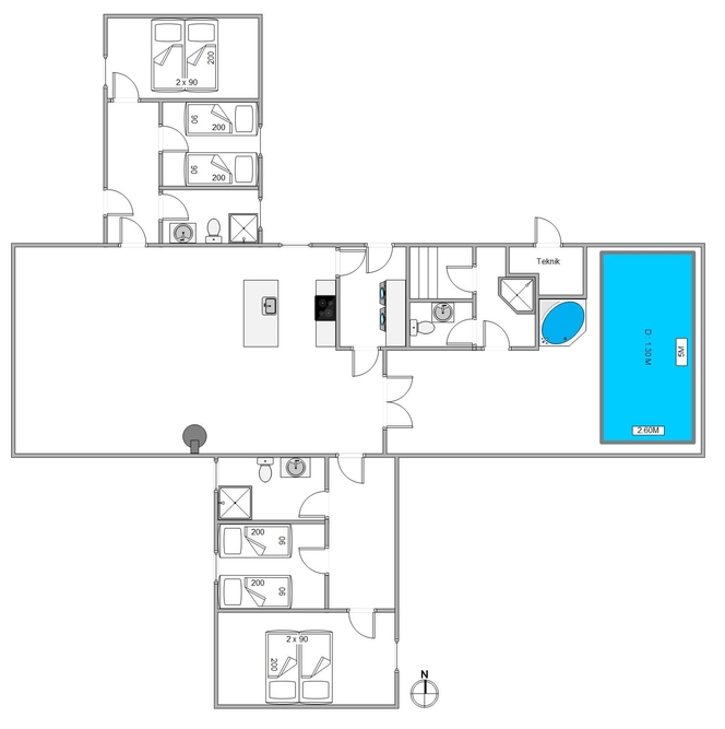 Sommerhuset er velindrettet med 4 fine soverum fordelt i 2 soveafdelinger, som hver har sit badeværelse, hvilket gør huset særdeles velegnet til 2 familier, der gerne vil holde ferie sammen. Derudover er der to store hemse, hver med soveplads til to personer og med plads til leg.