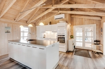 Hjertet i dette 180 kvadratmeter store og hyggelige feriehus er det centrale opholdsrum med en flot og praktisk indrettet køkkenafdeling med bl.a. 80 l. fryser, mikroovn og opvaskemaskine.