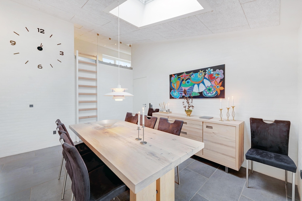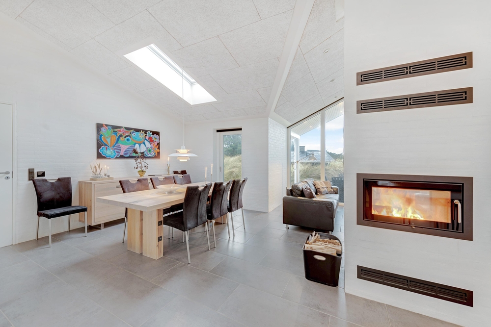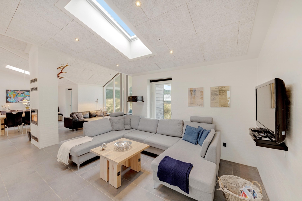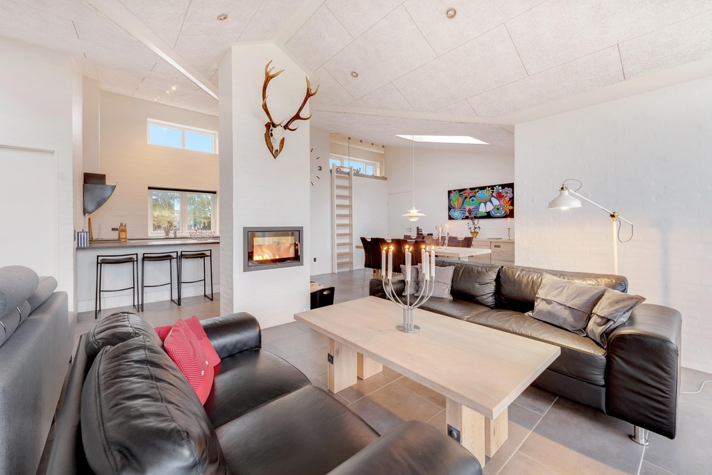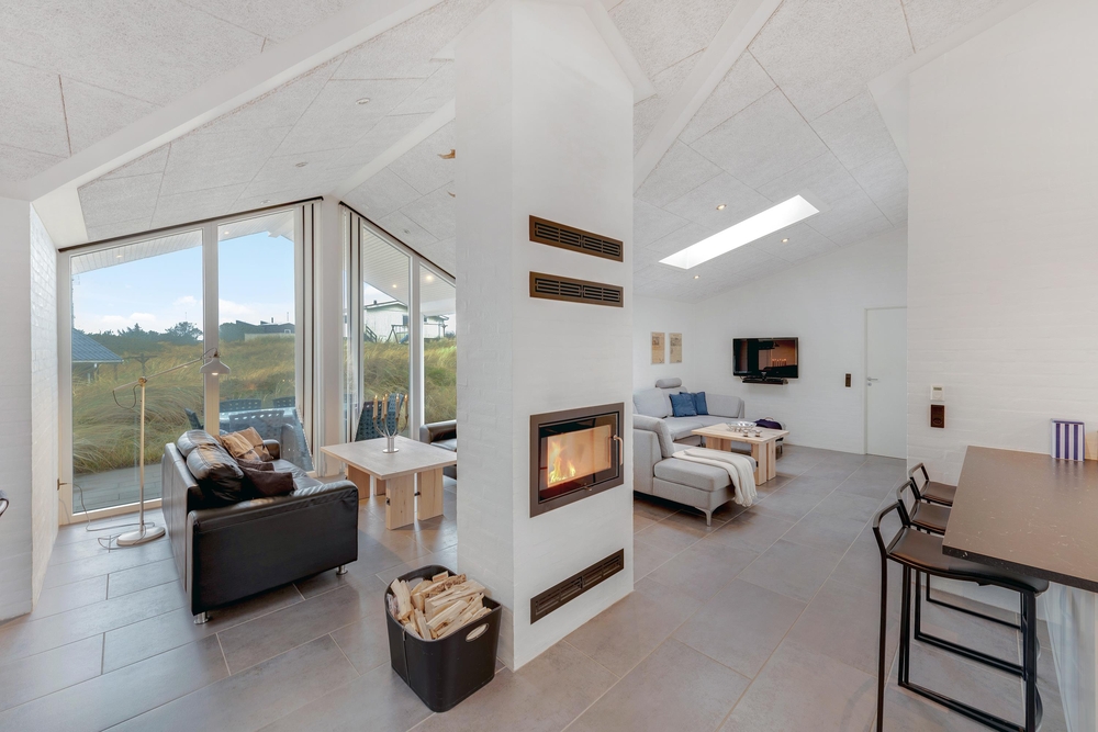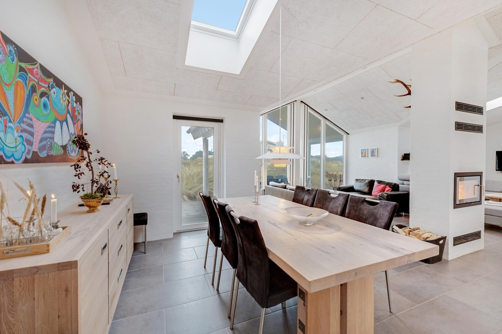 Stilfuldt indrettet med masser af gode bekvemme siddemuligheder indbyder Risvej 8 til en dejlig ferie for op til 8 personer. Det store smukke fællesrum med det store moderne køkken er lyst og venligt indrettet og det har store vinduespartier for smuk udsigt og godt lysindfald. Om aftenen, når mørket falder på, så sørger en brændeovn for en hyggelig stemning.