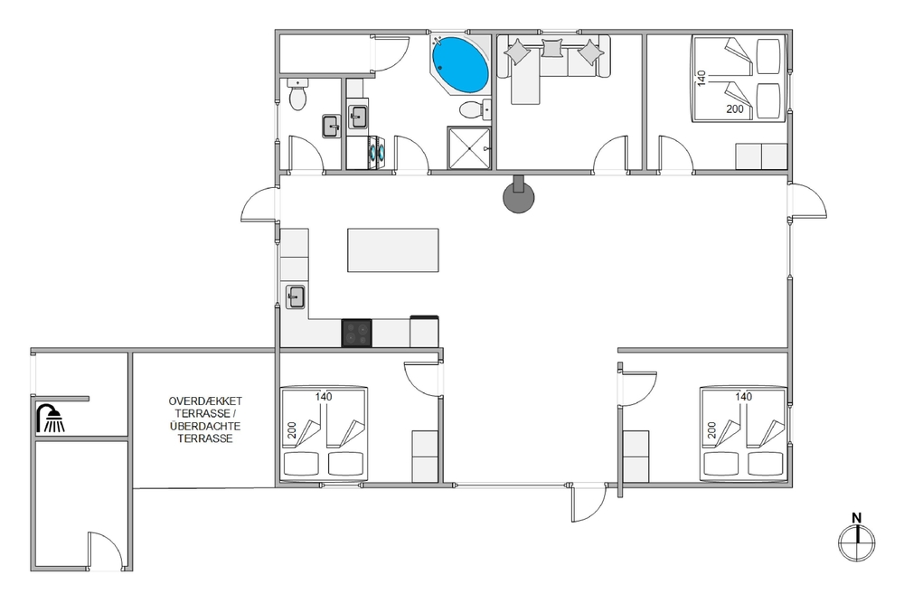 Når op til 8 personer vil holde ferie sammen, er det vigtigt, at der ikke opstår badeværelseskø. På Sand Holms Vej 1 har I ved siden af det store lækre badeværelse med egen spa naturligvis et ekstra gæste-wc. Det er helt uden bekymringer, I efter en lang dag med frisk vesterhavsluft kan fylder spaen op og lade jer glide ned i det varme vand. Her kan I slappe fuldstændigt af og bare nyde at have rigtig ferie.