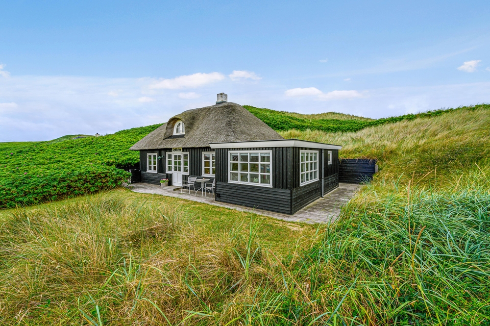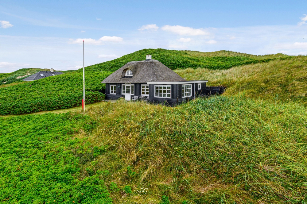 Sand Holms Vej 33 ligger smukt på randen af en klit. Det giver en skøn udsigt over området og dejlig læ for vestvinden. Hele vejen rund om huset er der anlagt terrasser, så I kan følge solen og altid finde et læhjørne, når der er behov for det. Når I sidder udenfor huset og nyder noget udetid, kan I ret høre lyden af havets bølger som en dejlig og afslappende baggrundslyd.
