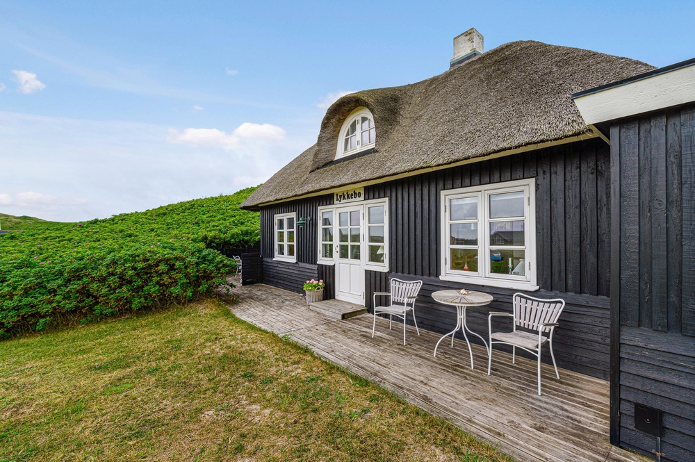 Ferie i bedste badehotelstil ? i Lykkebo, et smukt stråtækte feriehus, er rammerne sat for jeres dejlige idylliske ferie direkte ved Vesterhavet. Om det er afslapnings-, aktiv- eller en rigtig kæresteferie, så er Sand Holms Vej 33 et rigtigt godt valg. Her er jeres firbenede ven også velkommen på ferie.