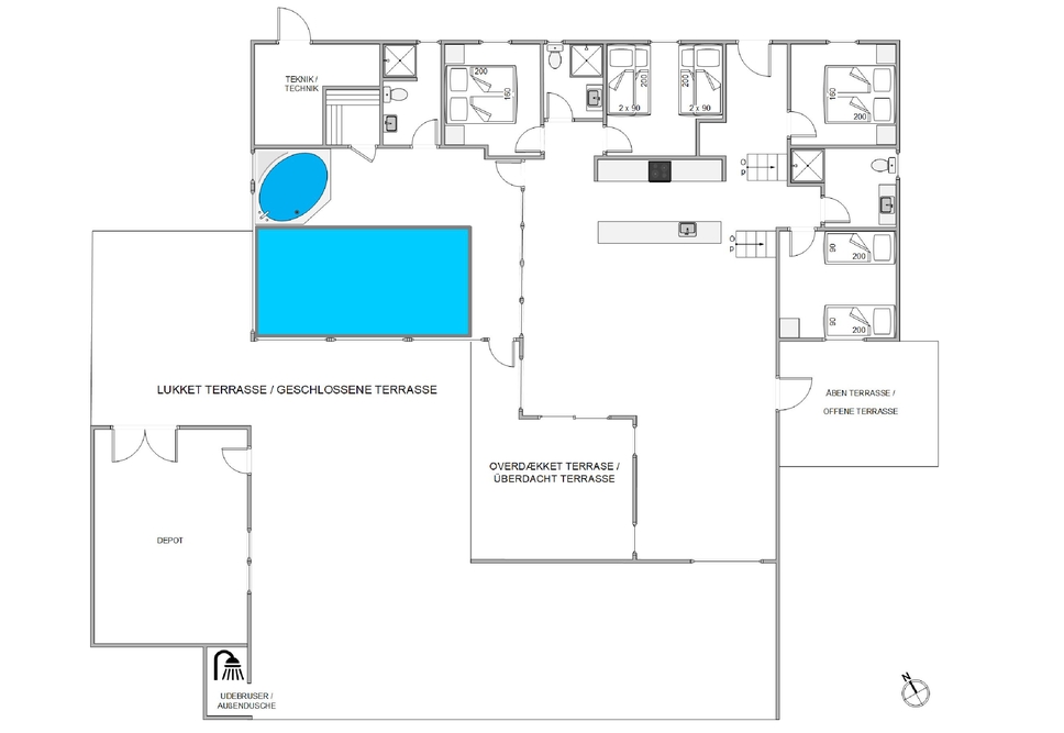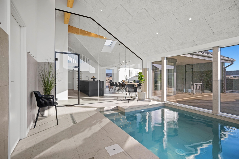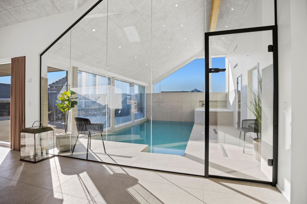 Et af husets højdepunkter er helt sikkert poolområdet og poolen med svømmetræner. Det er også her, I finder husets boblebad. Her kan I slappe af og bade uanset vejret! Der er også en sauna, hvor I kan varme jer og bare slappe af og fordybe jer. Derudover er der både billard, dart, trampolin og beachvolley bane, så underholdningen på ferien er sikret.