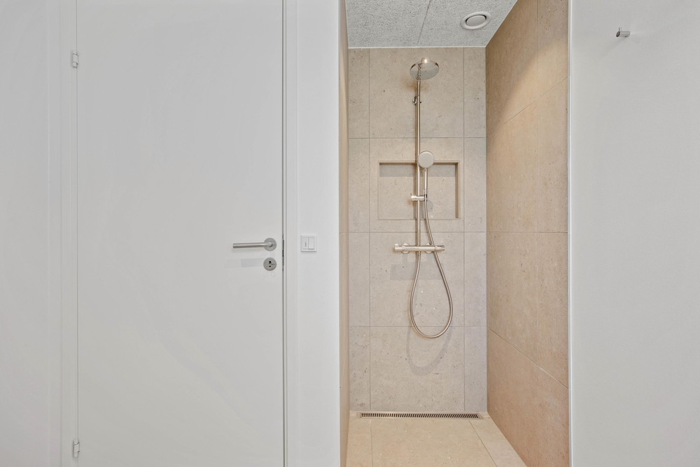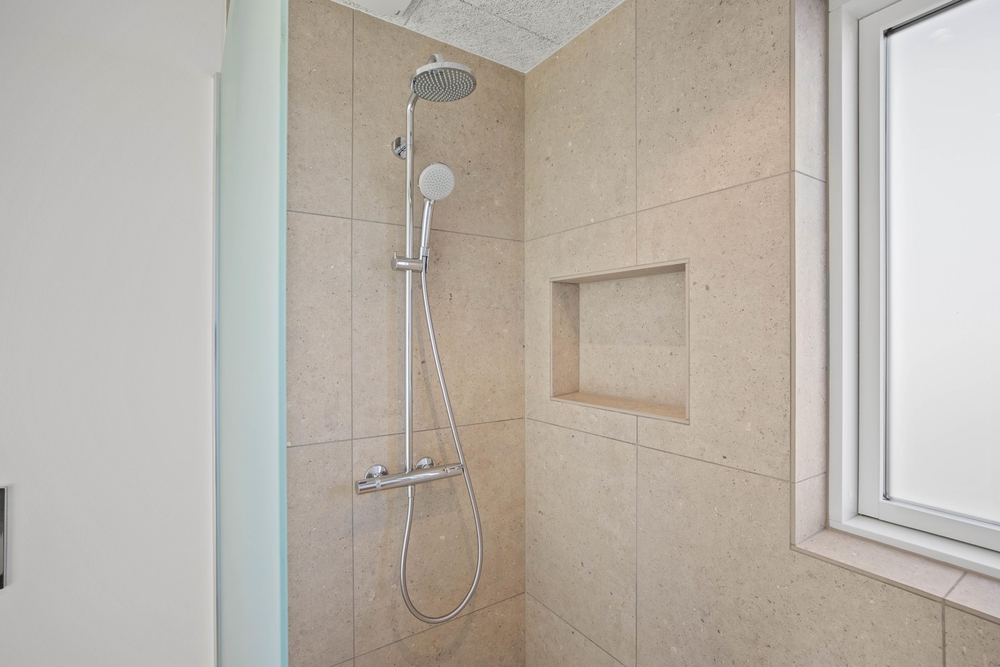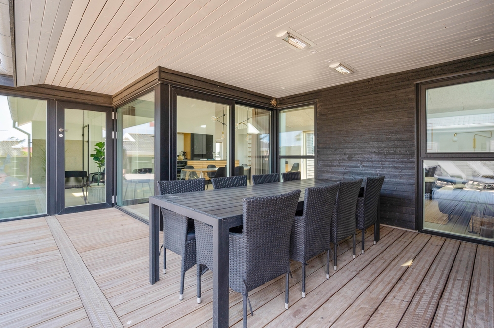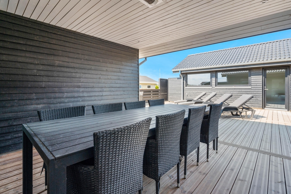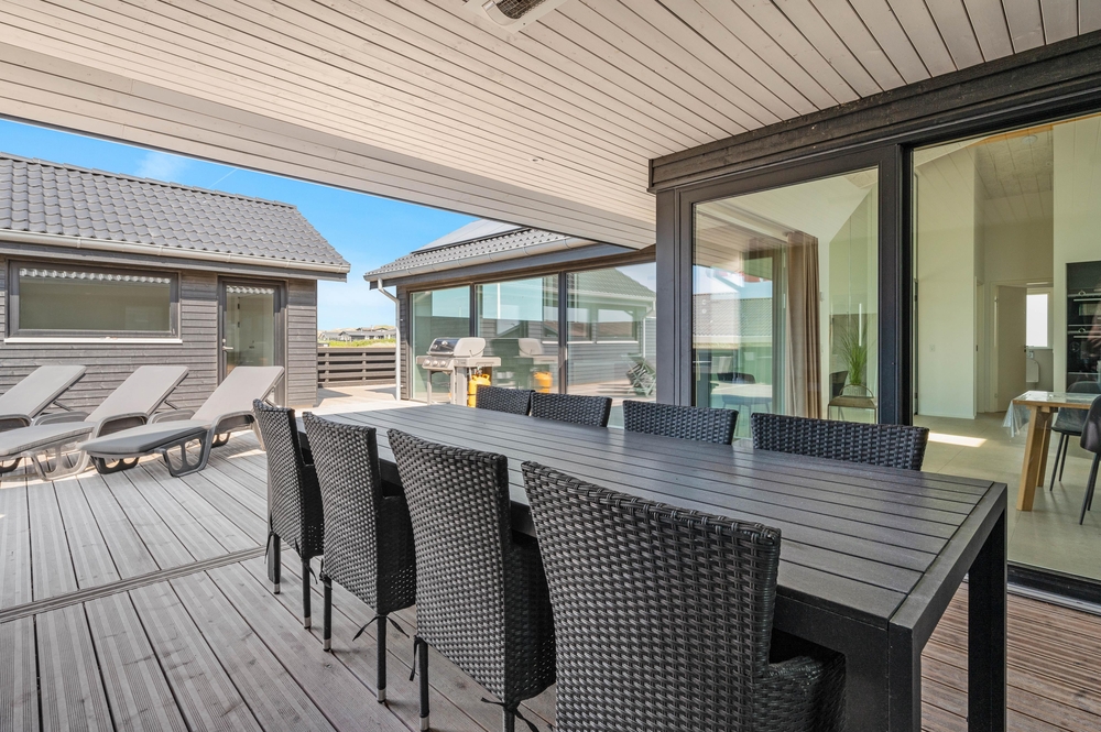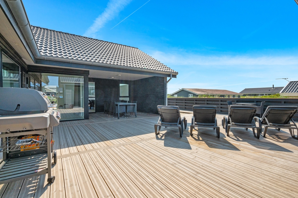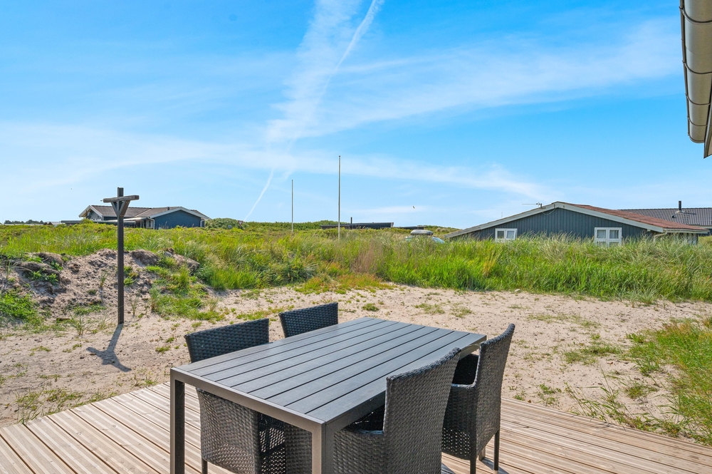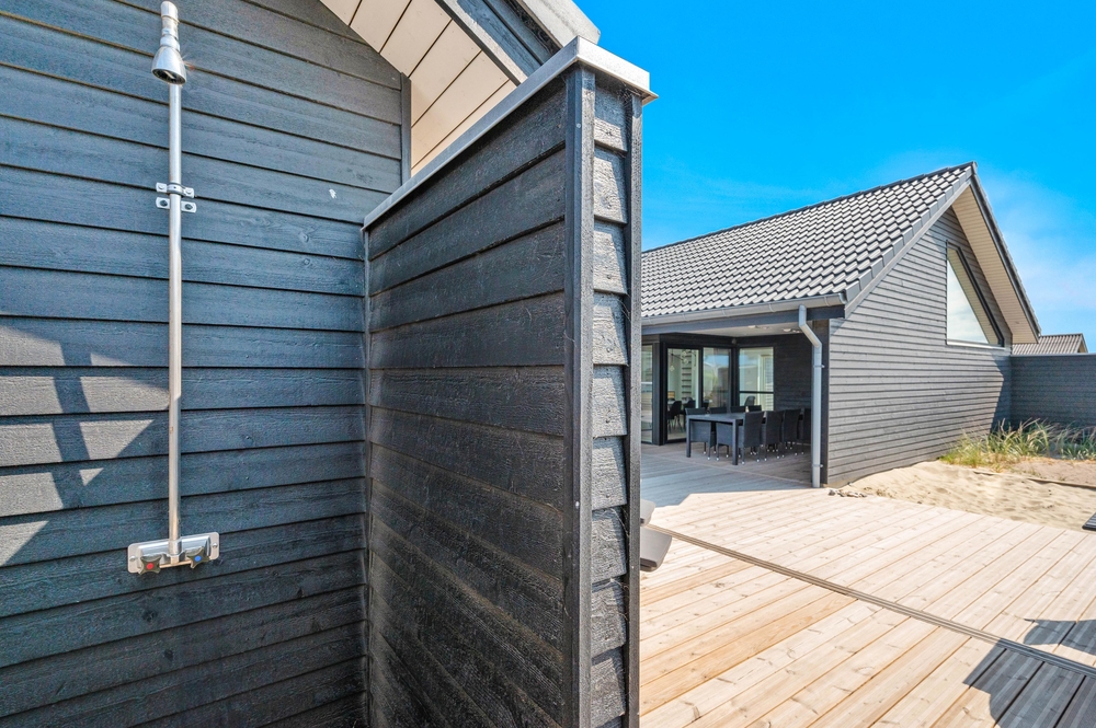 Der er en skøn, delvist overdækket lukket terrasse med udebruser. Her kan I forfriske jer efter en dag i solen eller skylle sandet af fødderne efter en lang gåtur på stranden. Udebruseren kan I benytte fra april til november. På terrassen står også havemøbler, terrassevarmer og gasgrill til fri afbenyttelse. Her kan I tilberede jer en lækker middag. For børnene er der både sandkasse og en gynge.