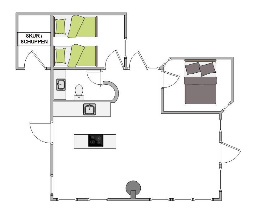 Somerhuset er omgivet af en delvist lukket træterasse, som går næsten hele vejen rundt om huset, hvilket er perfekt hvis I rejser med hund eller små børn. Her er god mulighed for at nyde solens stråler mens I kigger ud i rosenbuskene og sommerhusområdet. Der er både havemøbler og solsenge til fri afbenyttelse. Der er selvfølgelig også en grill til rådighed, så I kan grille et dejligt måltid mad her på terrassen.