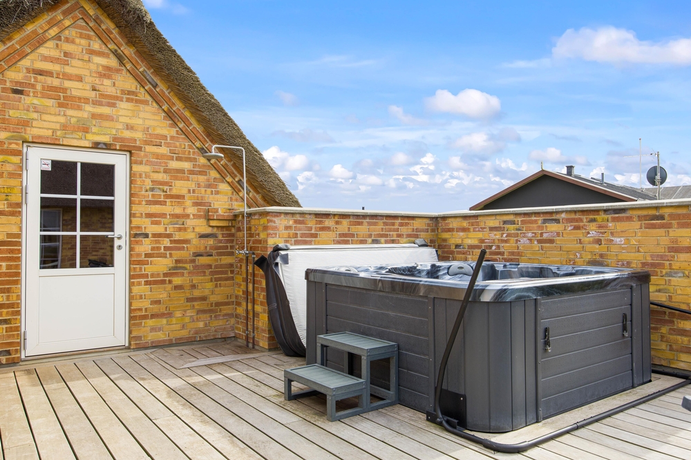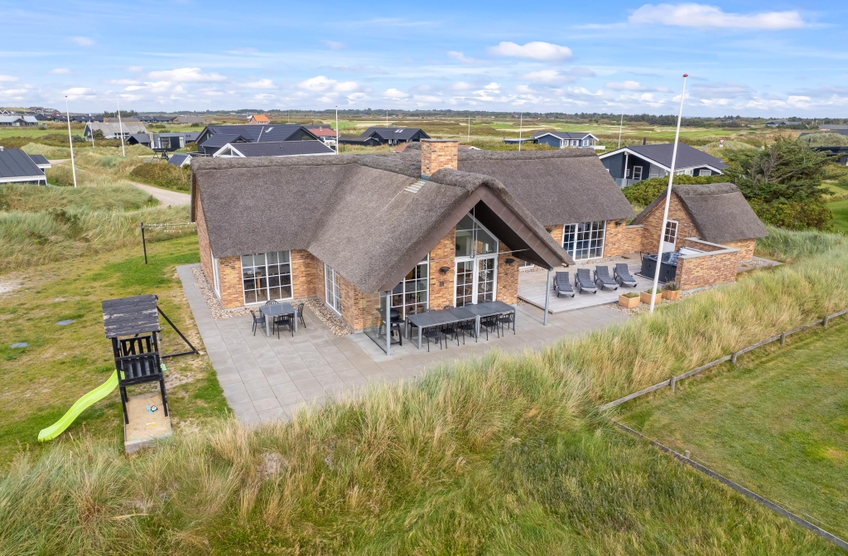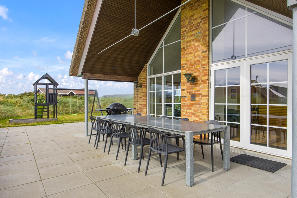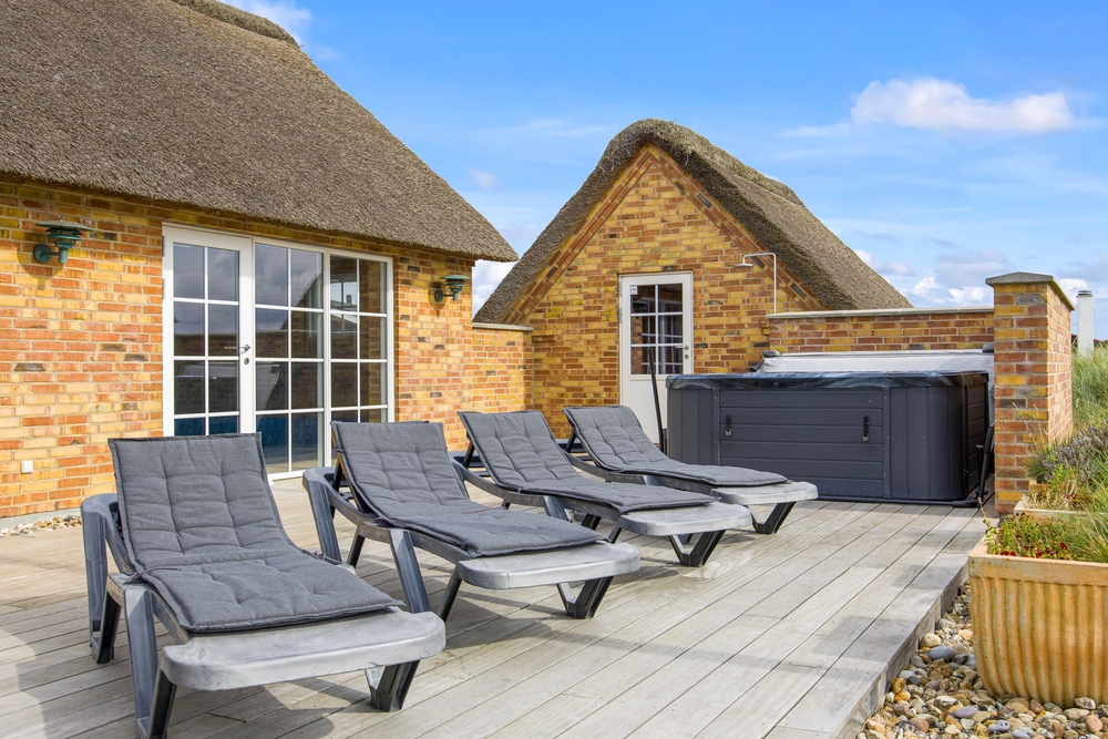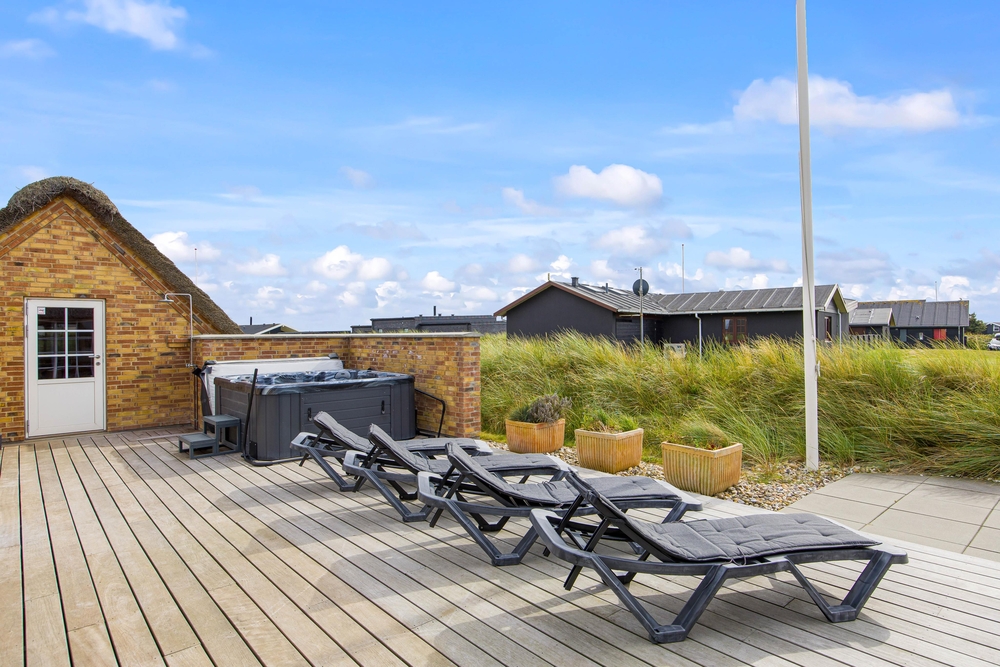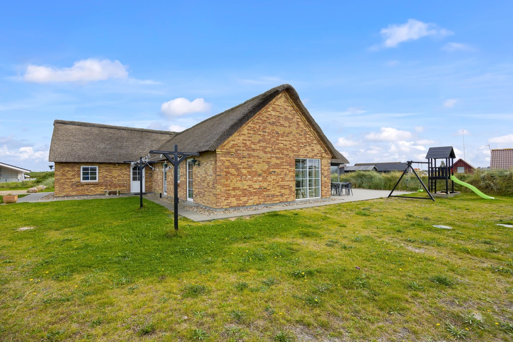 Udenfor feriehuset er terrasserne indrettet således, at man altid kan finde et afskærmet hjørne, hvor man kan hygge sig med en god bog i de medfølgende havemøbler, når vejret er godt. Der er også en udendørsspa på terrassen, som giver en særlig oplevelse under stjernehimlen. Til børnene er der et legetårn, hvor de kan klatre, gynge og rutsje, og kun fantasien sætter grænser for hvad de kan lave. Efter en lang dag på stranden kan I tænde op for gasgrillen og nyde de lækkerier, I har købt i Søndervigs supermarked, som ligger ca. 1,4 km væk.