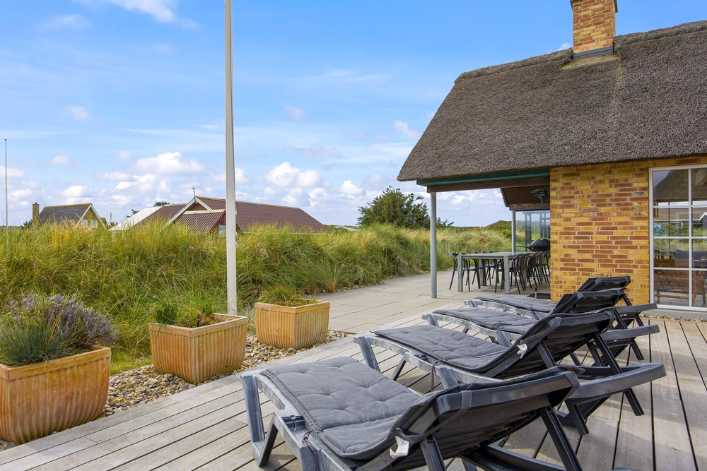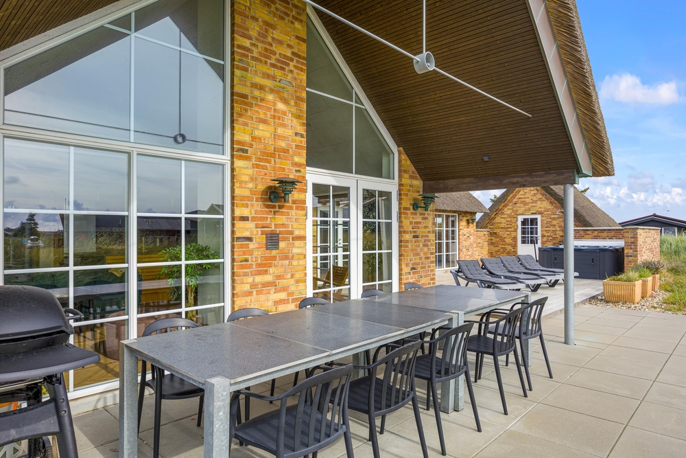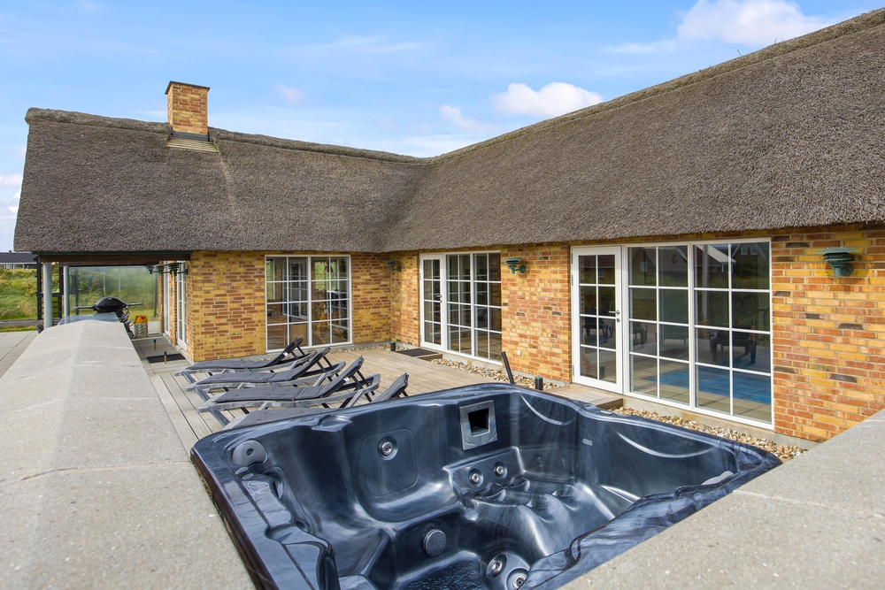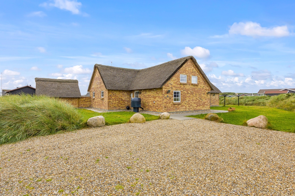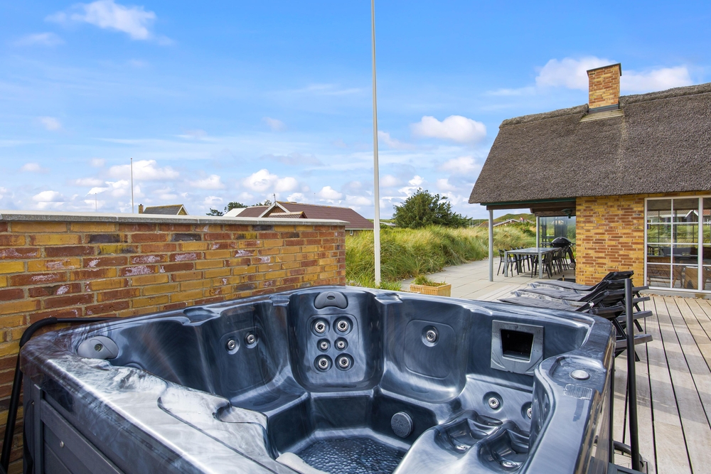 Udenfor feriehuset er terrasserne indrettet således, at man altid kan finde et afskærmet hjørne, hvor man kan hygge sig med en god bog i de medfølgende havemøbler, når vejret er godt. Der er også en udendørsspa på terrassen, som giver en særlig oplevelse under stjernehimlen. Til børnene er der et legetårn, hvor de kan klatre, gynge og rutsje, og kun fantasien sætter grænser for hvad de kan lave. Efter en lang dag på stranden kan I tænde op for gasgrillen og nyde de lækkerier, I har købt i Søndervigs supermarked, som ligger ca. 1,4 km væk.
