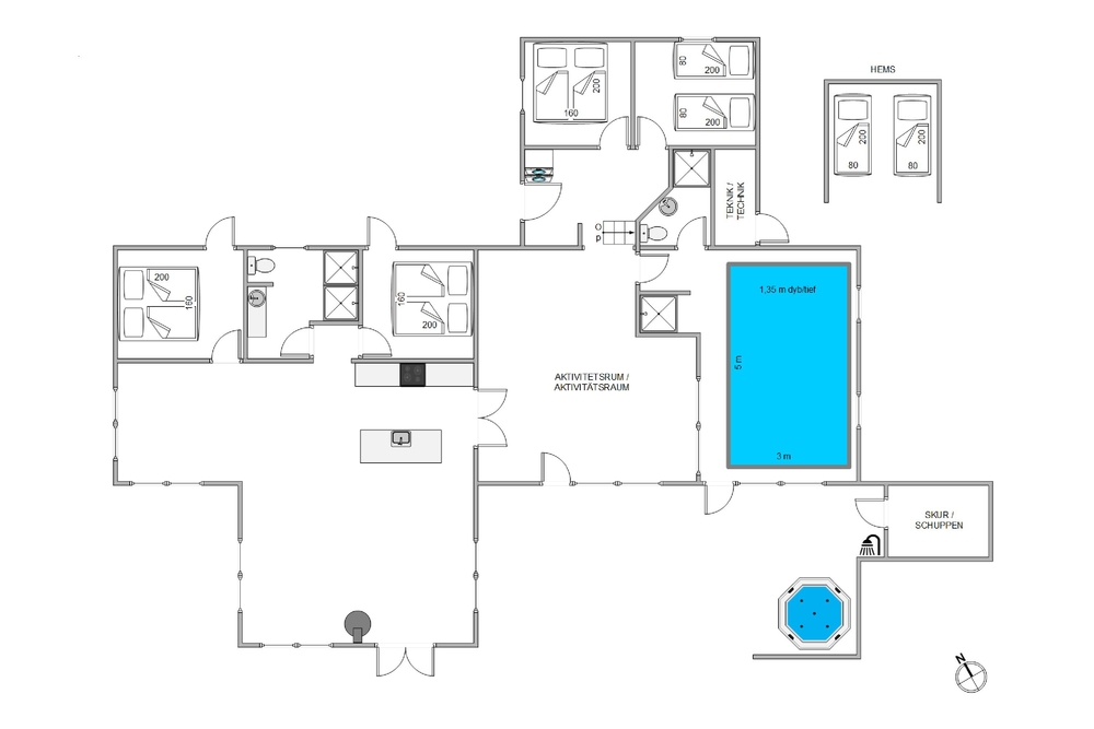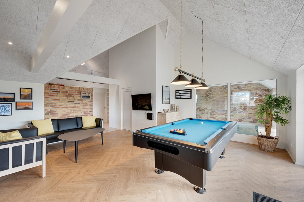 Mens nogle af jer ser en film i opholdsstuen, kan I andre dyste om, hvem der skal være feriens mester i billard eller bordtennis i aktivitetsrummet. Fra aktivitetsrummet er der adgang til poolrummet, som vil være højdepunktet for vandhundene iblandt jer. Hvis I vil være aktive under ferien, kan I også tænde for poolens modstrømsanlæg.