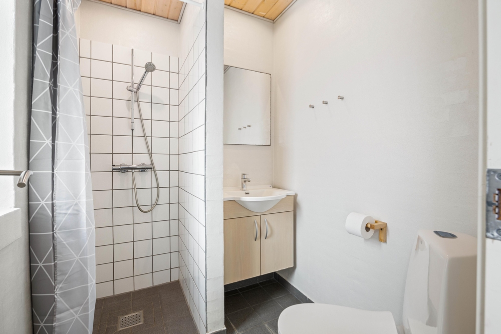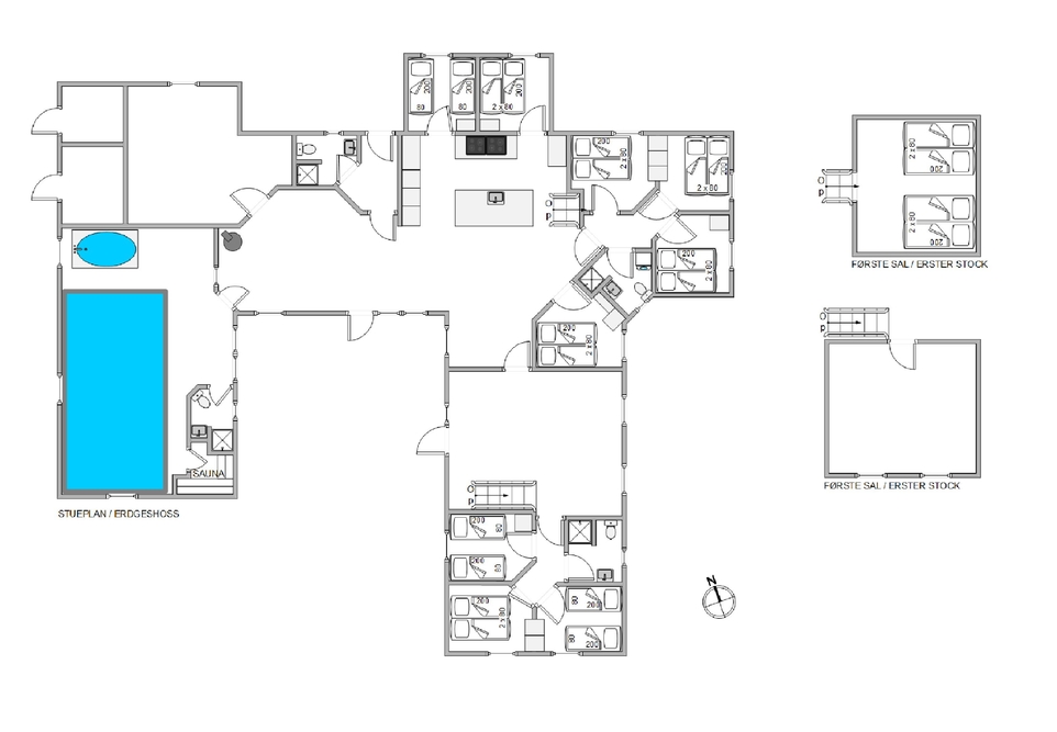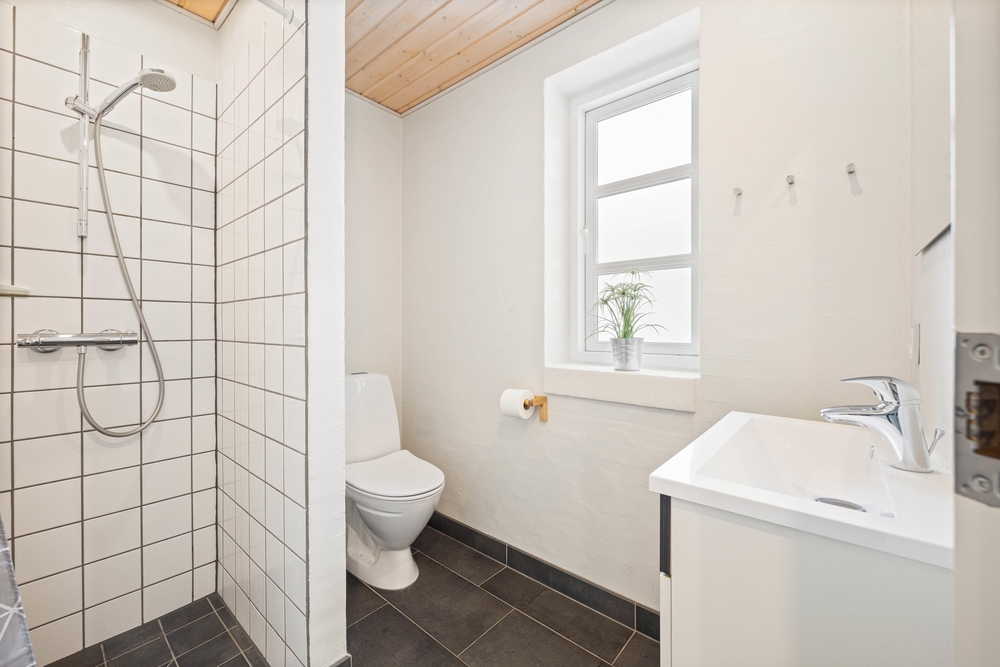 I sommerhuset finder I i alt 4 badeværelser med gulvvarme. 18 af sommerhusets 22 sovepladser er fordelt på i alt 9 soveværelser. De resterende 4 sovepladser finder I på førstesalen, hvor der er 4 enkeltsenge i ét rum.