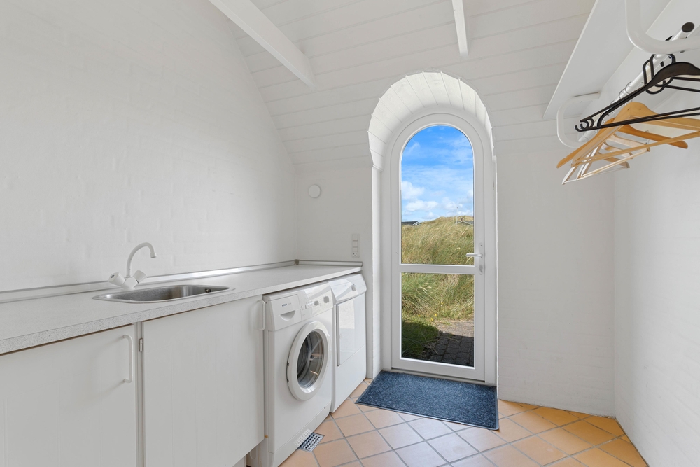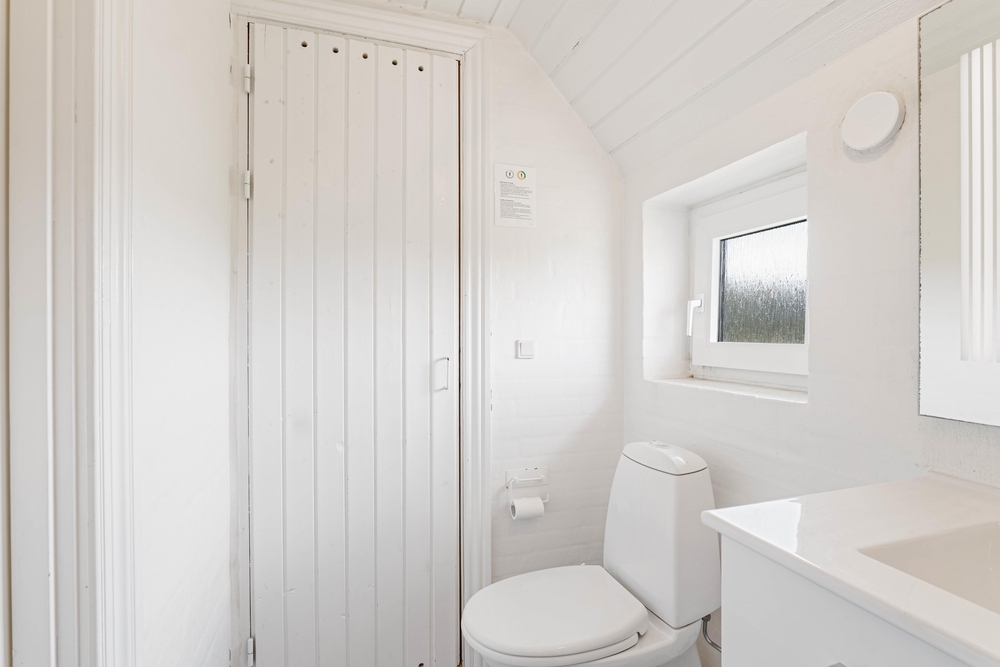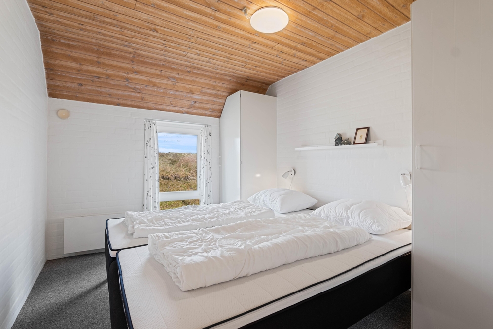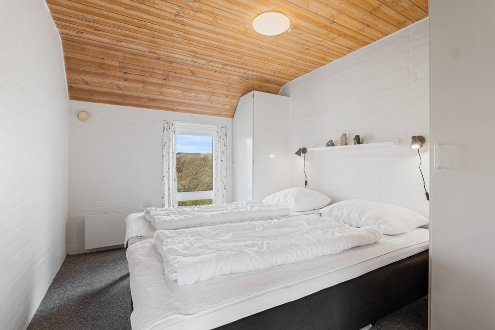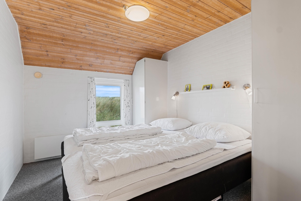 De 2 badeværelser med gulvvarme bidrager til at forhindre trafikpropper om morgenen. Her kan du også vaske og tørre tøj. 4 soveværelser med komfortable dobbeltsenge og hems med 2 ekstra senge sikrer en god nats søvn i den friske luft efter en spændende dag på Vestkysten.