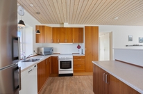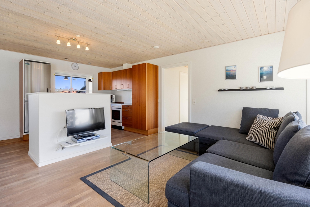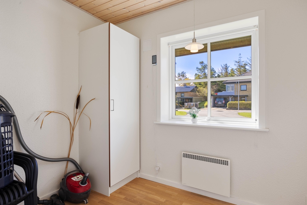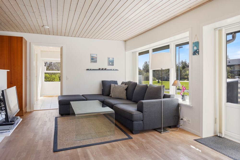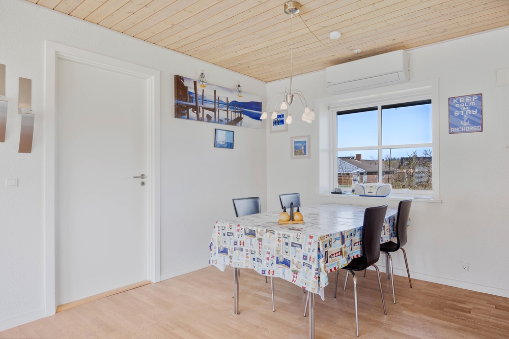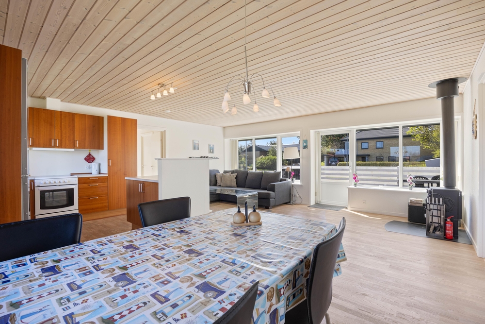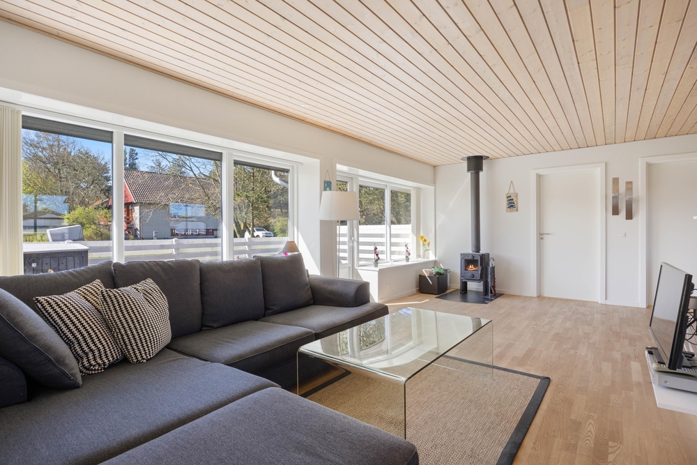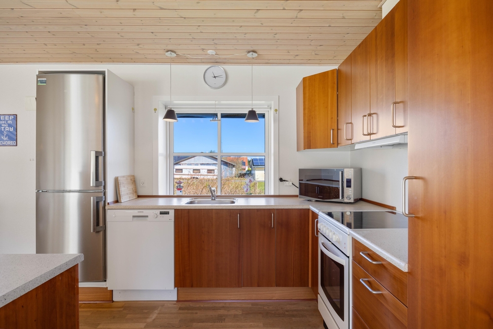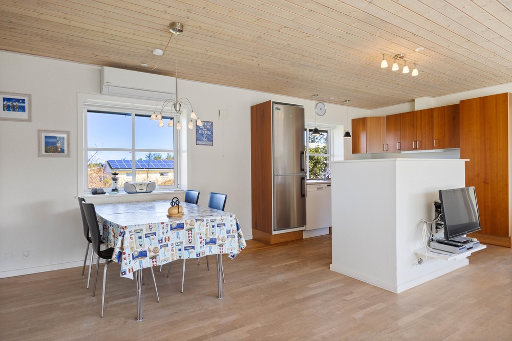 Familiens samlingspunkt bliver alrummet, der kombinerer stue, spiseplads og køkken i ét. Her giver de mange vinduer et skønt lysindfald, og brændeovnen sørger for varme samt en ekstra hyggelig feriestemning. I det velfungerende køkken kan I kreere nogle skønne retter, der samler familien omkring spisebordet. Prøv en lækker simreret eventuelt sammen med et godt glas vin. Opvaskemaskinen klarer oprydningen, så I i stedet kan sætte jer til rette med en god bog eller film i fjernsynet. Sommerhuset har nemlig et Chromecast, så I har mulighed for at streame jeres yndlingsserier.