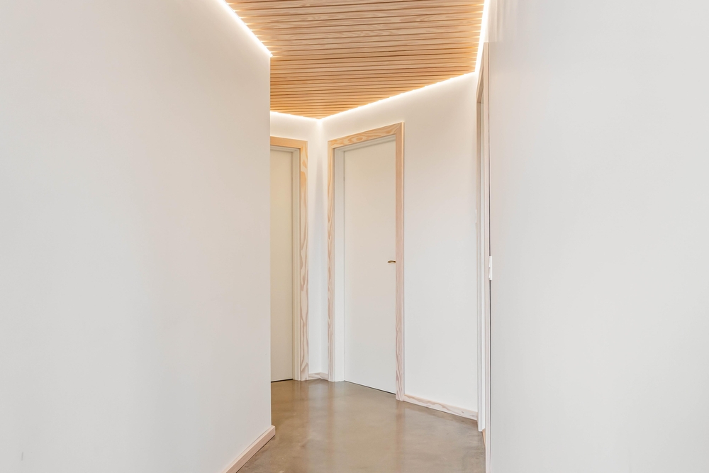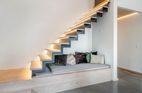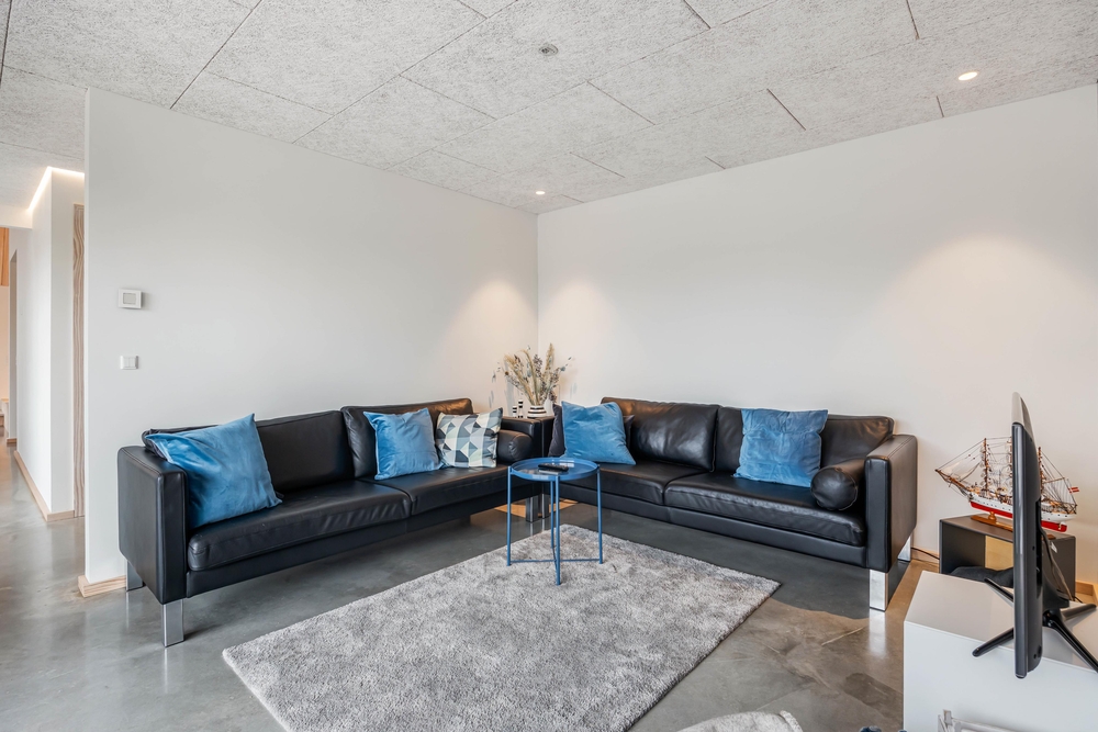 Sommerhuset på Skovsletten 6 har mange lækre detaljer i interiøret og indretning, hvor æstetikken taler et sprog for sig selv med de blanke stengulve og mange lysindfald fra panoramastore vinduer. Der er også kunstigt lysindfald langs flere lister samt en oplyst svævende trappe med hyggehjørne under. Det skal opleves!