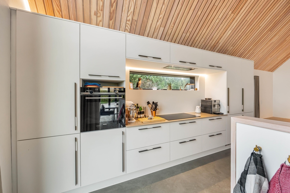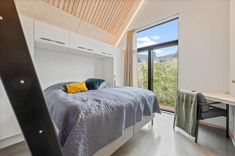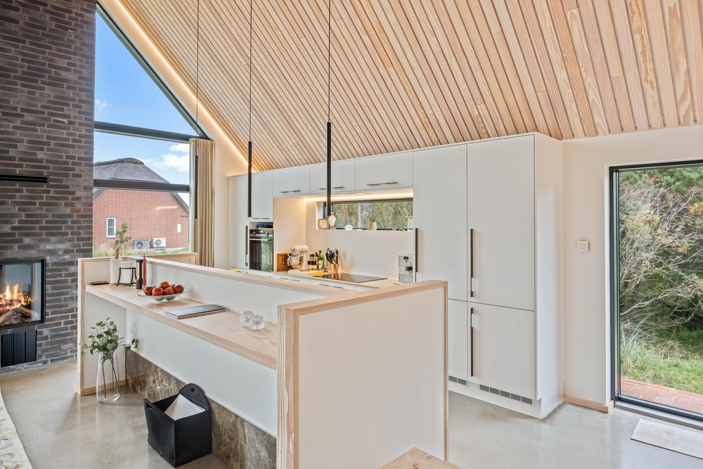 Køkkenet er praktisk indrettet med køleskab, fryser til 60 liter og en opvaskemaskine, og det ligger i åben forbindelse til spisepladsen. Her kan I nyde gode familiemiddage med pejsens knitren i baggrunden. De 4 soveværelser med dobbeltsenge er rummelige og udstyret med lækre kvalitetssenge og god skabsplads, og varmepumpen gør feriehuset energivenligt. Der er også både tørretumbler og vaskemaskine til rådighed.