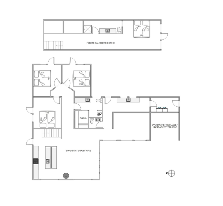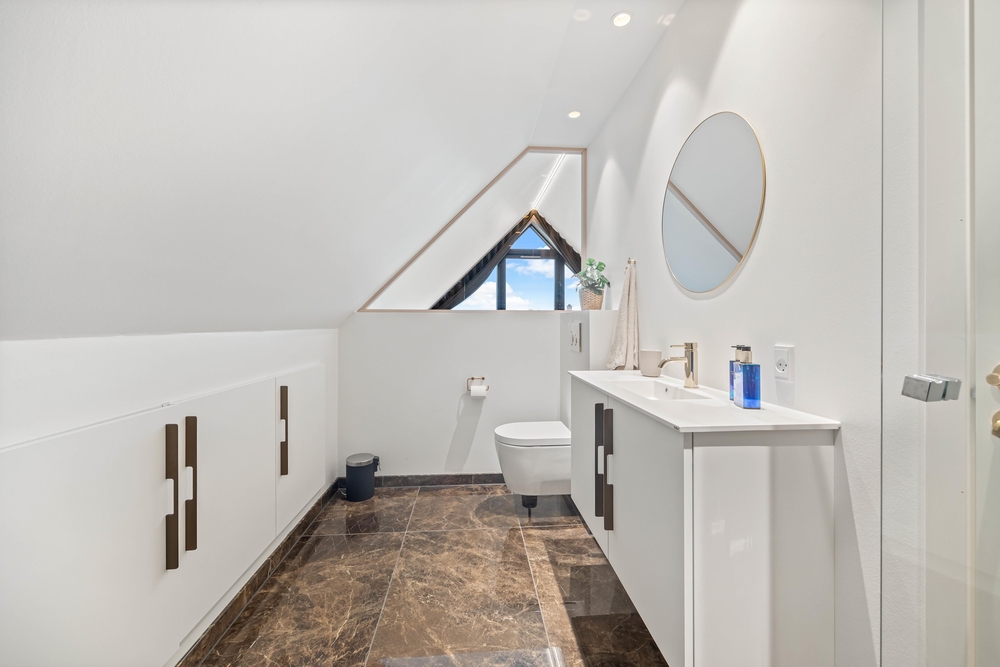 De 2 badeværelser har indretningsmæssigt flotte marmordetaljer, og begge har varme i gulvet, og der findes også et separat toilet, så ingen grund til at bekymre jer om kødannelse. Arrangér din egen hygge- og spadag, der ender med en tur i saunaen og måske en tur udenfor med et koldt gys under bruseren? Udendørsbruseren er også ideel efter en tur på stranden på de varme dage til at få det sidste sand skyllet af.