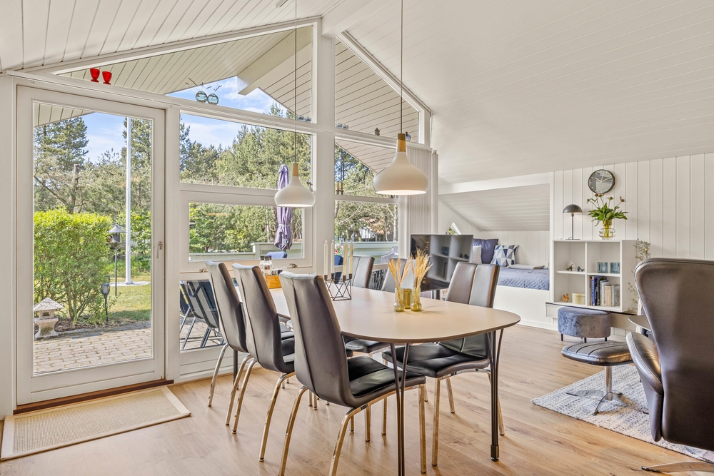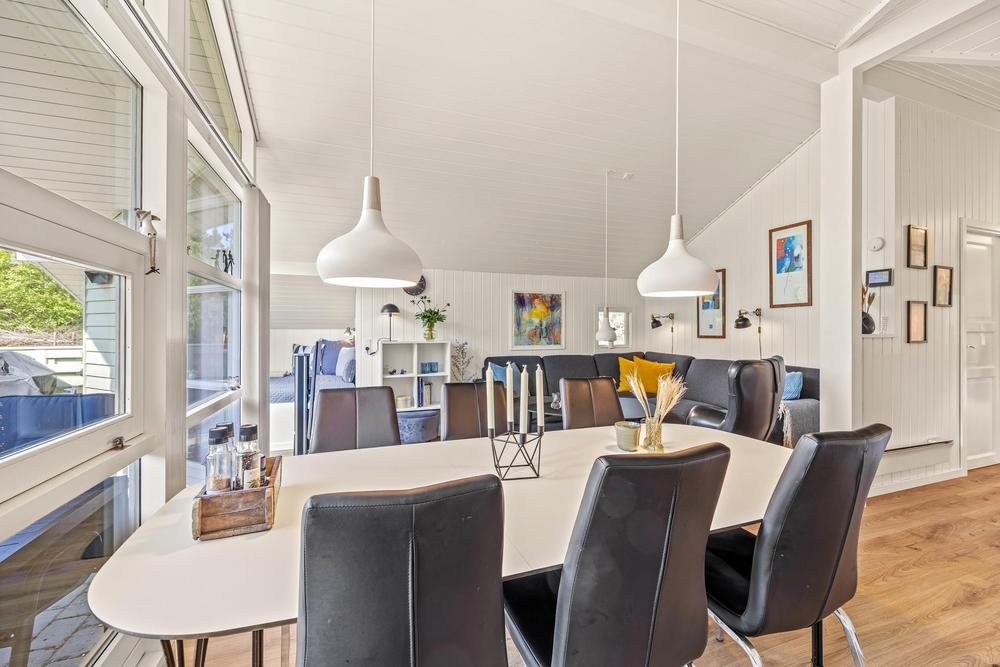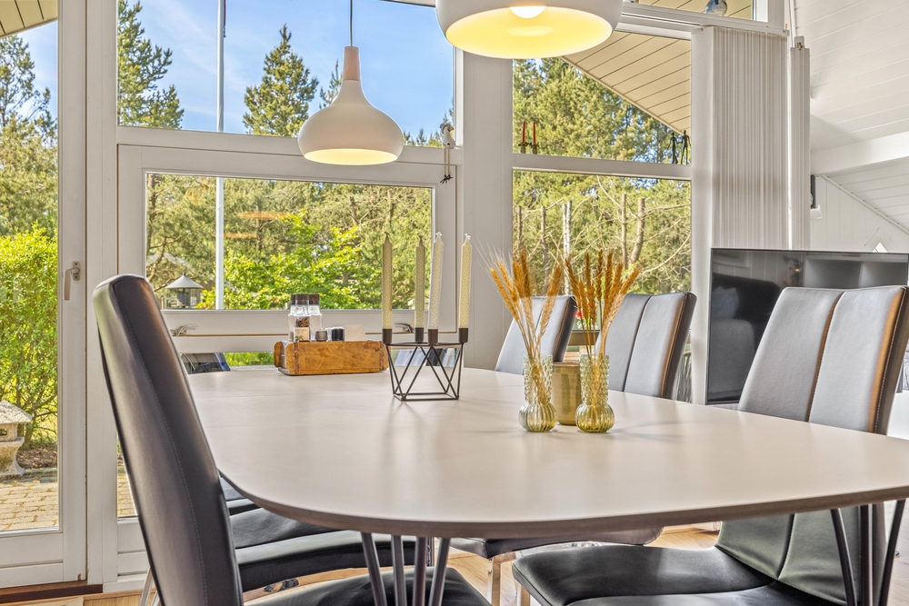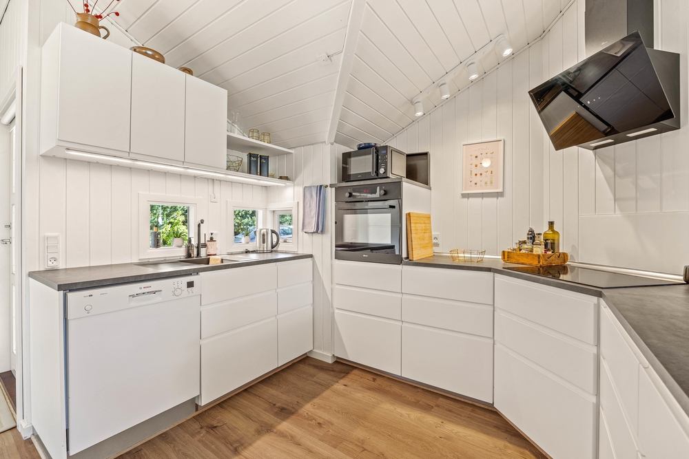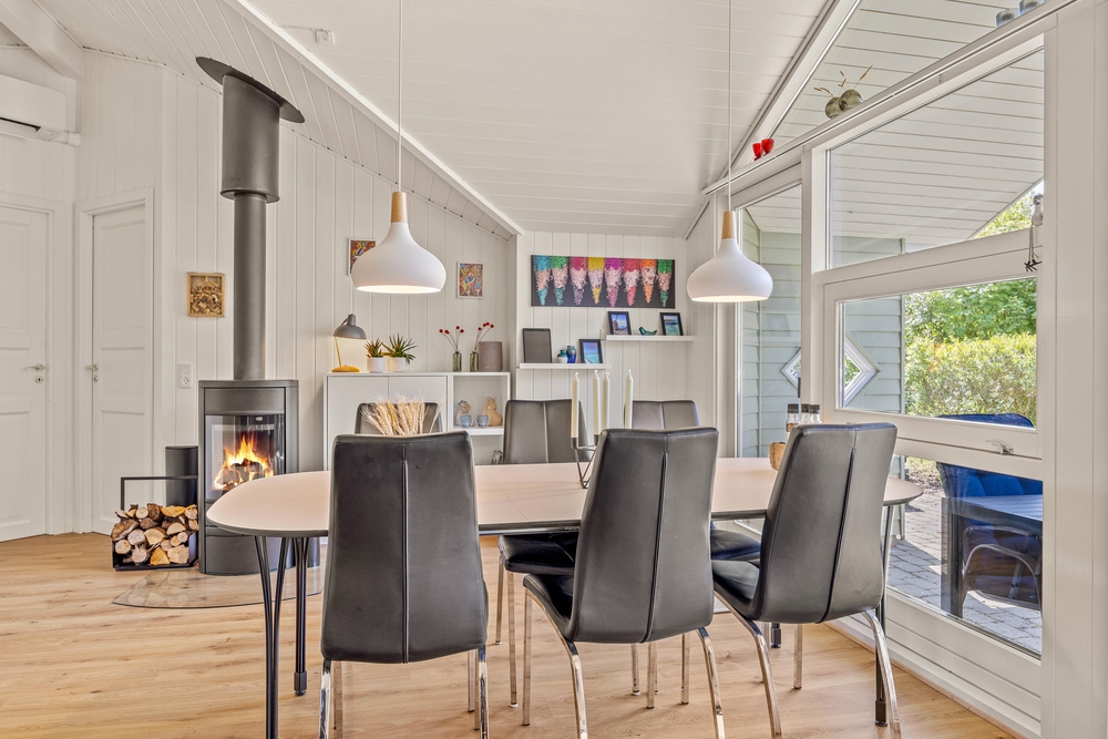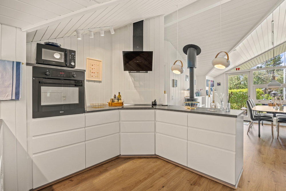 Træhuset er lyst og hjemligt indrettet, og den kombinerede spisestue med integreret nyt køkken (2022) er husets hjerte og bliver centrum for samvær i løbet af ferien. De store vinduesfronter lader solens lys slippe ind og giver jer samtidig en flot udsigt ud over haven og naturen, som I bor midt i. Efter maden kan I sætte jer godt til rette i sofaen og nyde varmen fra brændeovnen, mens opvaskemaskinen klarer oprydningen for jer.