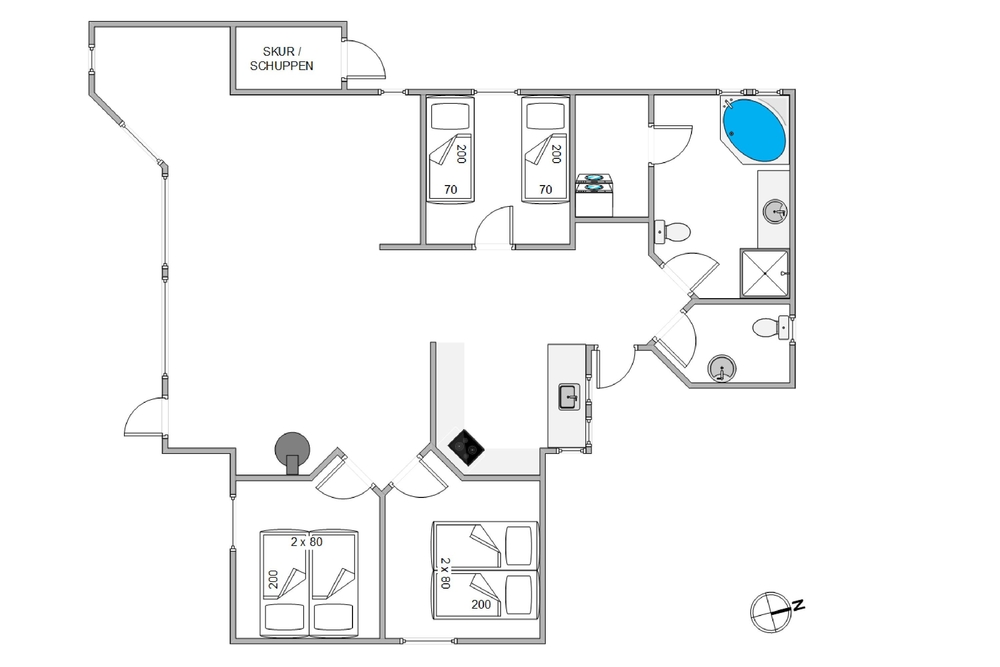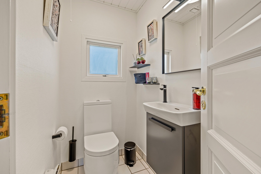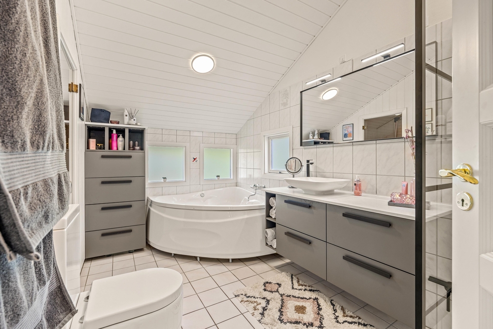 Har I brug for at slappe ekstra meget af og tanke ny energi efter en stresset hverdag, er det store badeværelse udstyret med spabad i det 2023 renoverede badeværelse. Her har I al tid i verden til at læne jer tilbage i varmen, mens gæstetoilettet sørger for, at der ikke bliver kø ude foran døren. Skal I på ferie i længere tid, bliver vaskemaskinen helt sikkert et hit, og her kan børnenes tøj hurtigt blive rent igen efter en dag udenfor.