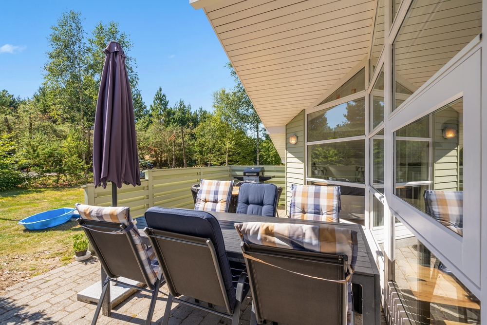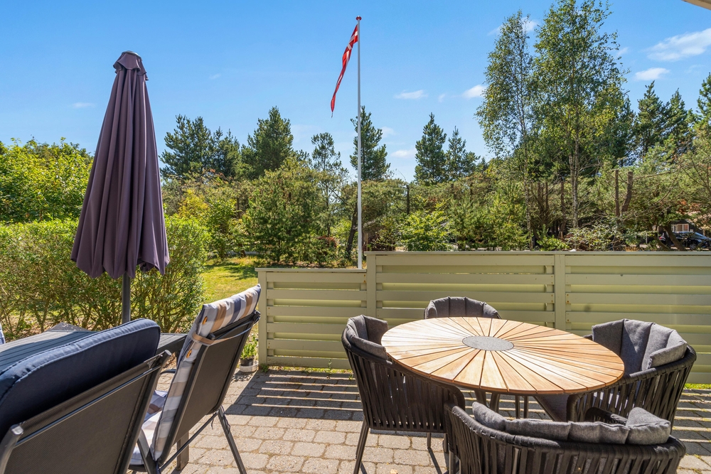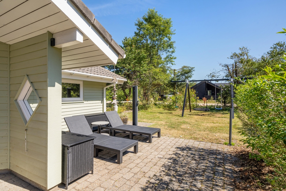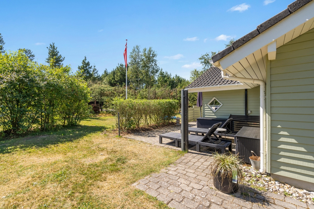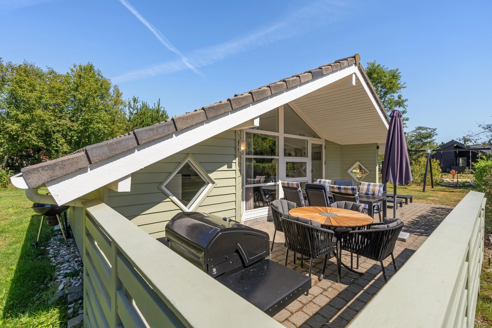 Huset er omgivet af en stor have med masser af græsplæne, og fra stuen kommer I ud på den skønne terrasse. Her kan I helt uforstyrret nyde feriedagene og solen, mens børnene tumler på græsplænen eller leger på gyngestativet eller i sandkassen. Om aftenen kan I tænde op i grillen, og på den overdækkede del af terrassen kan I tilberede et lækkert grillmåltid ligegyldigt vind og vejr.