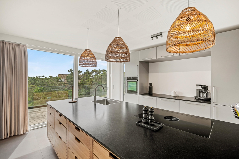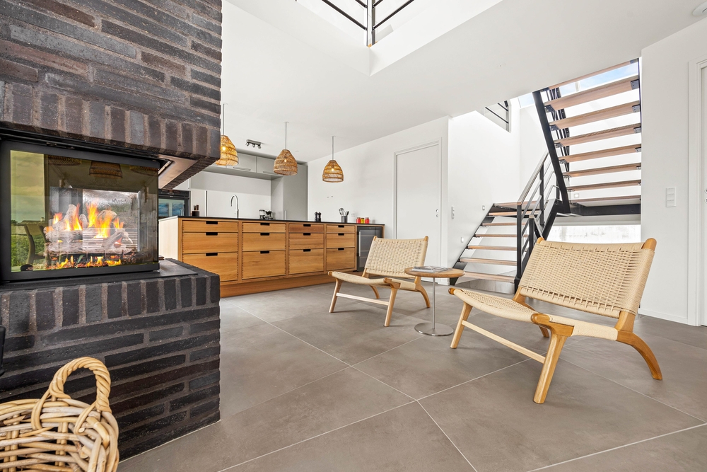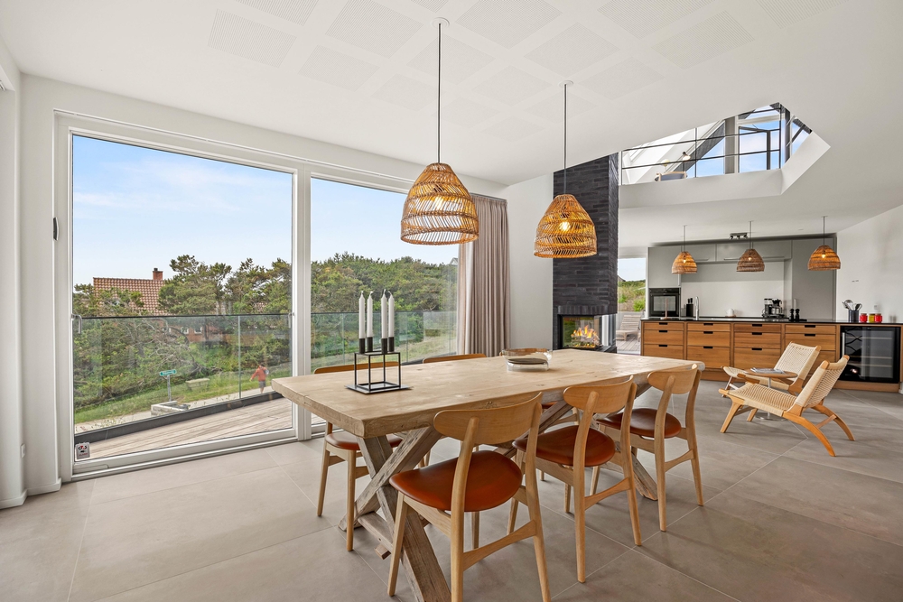 Den mellemliggende etage er hjertet af sommerhuset, hvor det store, åbne køkken/alrum og opholdsstue med store glaspartier skaber en skøn ramme for fælles aktiviteter og hyggelige timer. I stuen kan I blot streame jeres yndlingsfilm via Chromecast eller nyde varmen fra den hyggelige pejs.