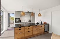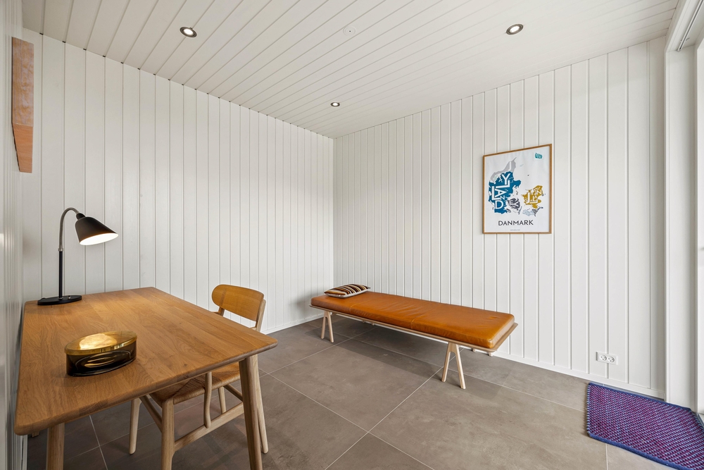 Køkkenet er udstyret med moderne apparater, herunder en opvaskemaskine og en separat 40L fryser, hvilket sikrer problemfri madlavning og opbevaring af madvarer. Den lyse og rummelige stue giver direkte adgang til den lukkede og overdækkede terrasse, hvor I kan nyde måltider udendørs eller bare slappe af med en god bog ? måske med glas vin, der har stået på køl i vinkøleskabet?