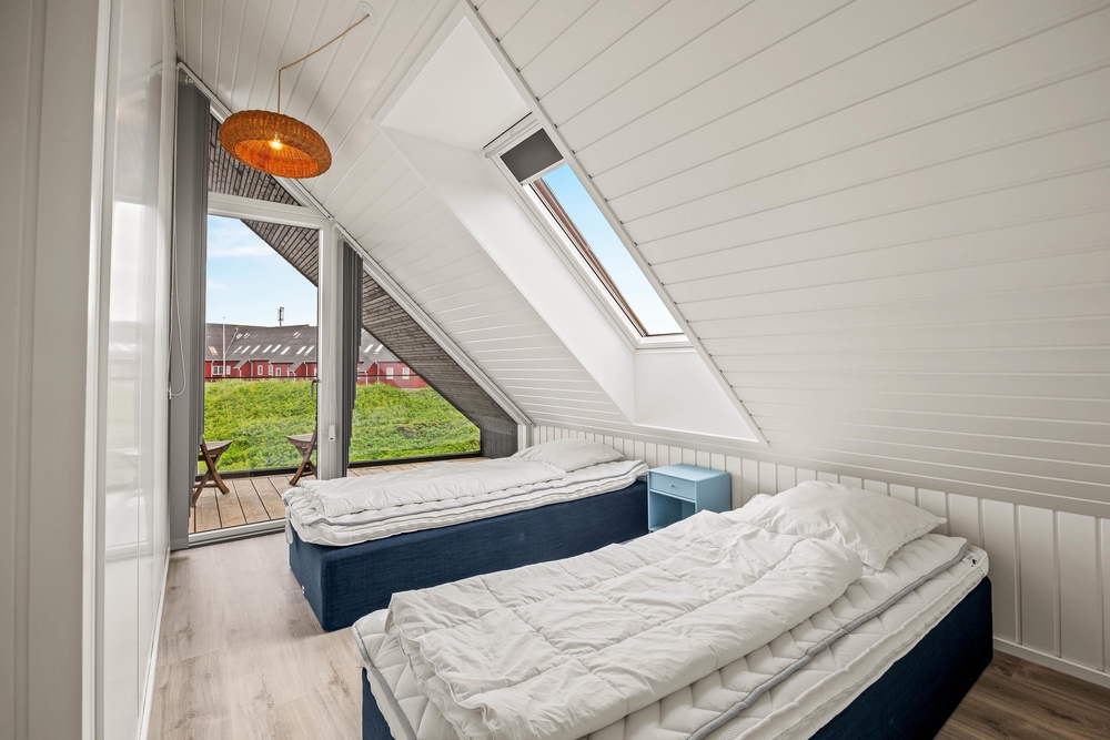 Øverste plan byder på endnu en stue, det 2. badeværelse og 3 komfortable soveværelser, som alle er indrettet med fokus på ro og afslapning. På denne etage er der også adgang til en balkon, hvorfra I kan nyde panoramaudsigten over landskabet.