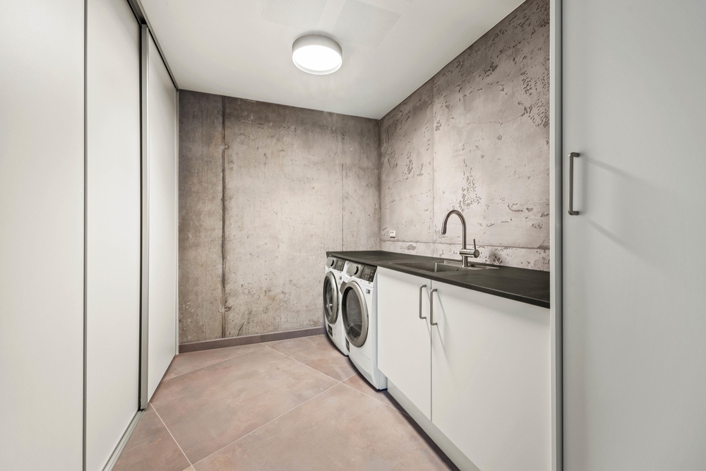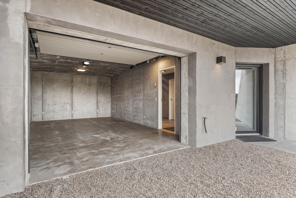 Nederste plan råder over en lukket garage, som kan rumme en enkel bil. Her findes også en separat indgang med en entré samt et praktisk bryggers, som er udstyret med både vaskemaskine og tørretumbler.