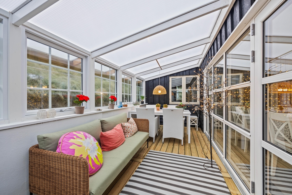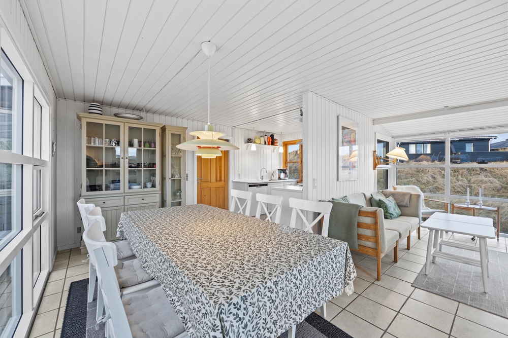 Udestuen indbyder til mange gode feriestunder med en friskbrygget kop kaffe og et spil kort, og her kan I betragte det flotte klitlandskab i alt slags vejr. På de kolde efterårs- og vinterdage vil brændeovnen sørge for god varme og ægte feriestemning.