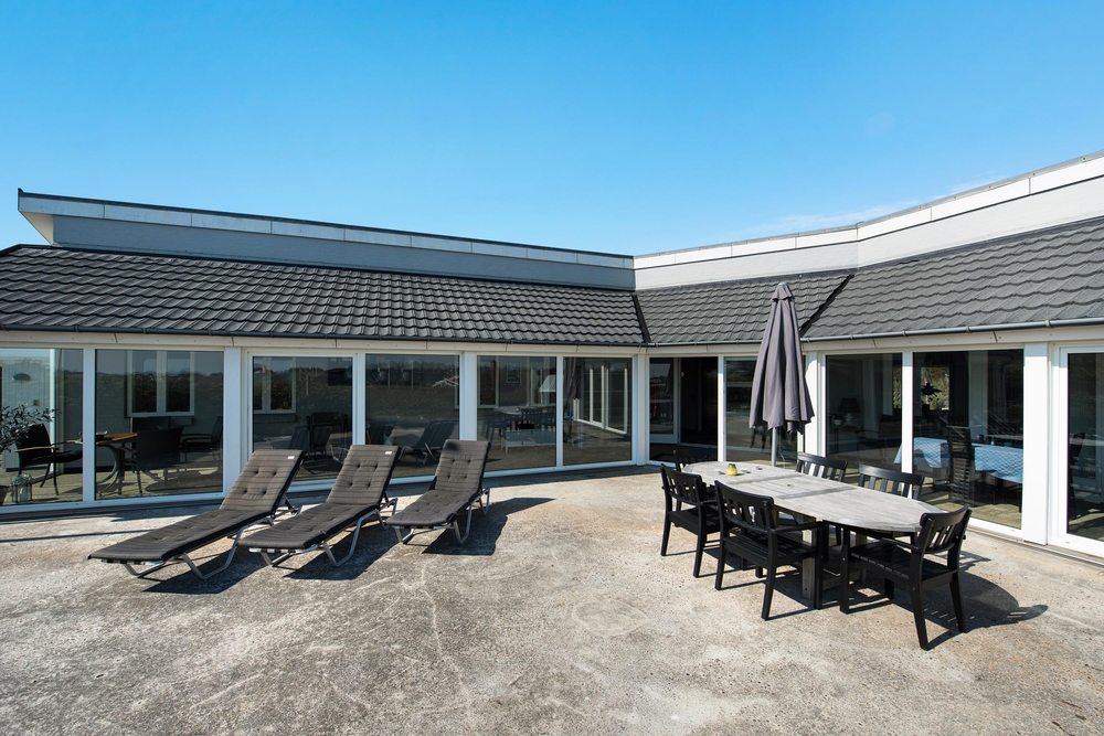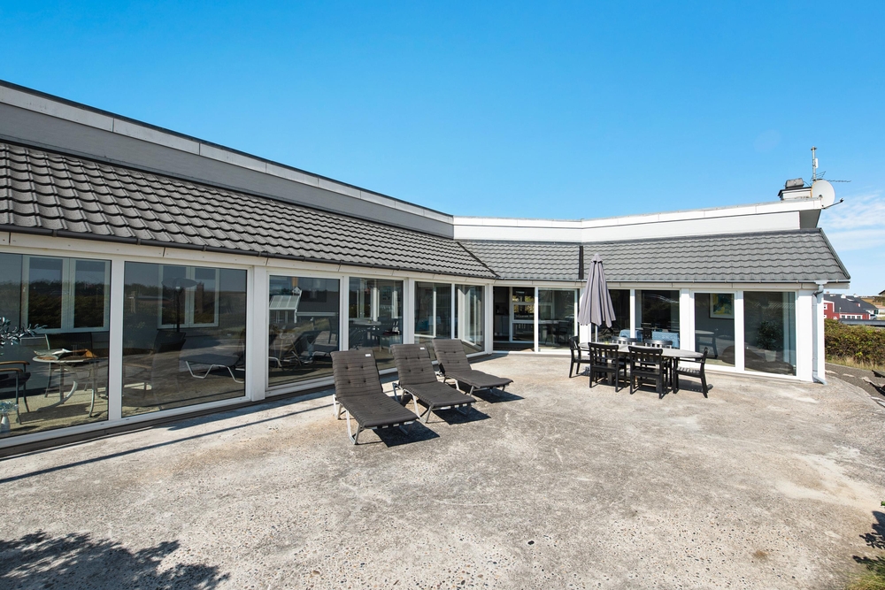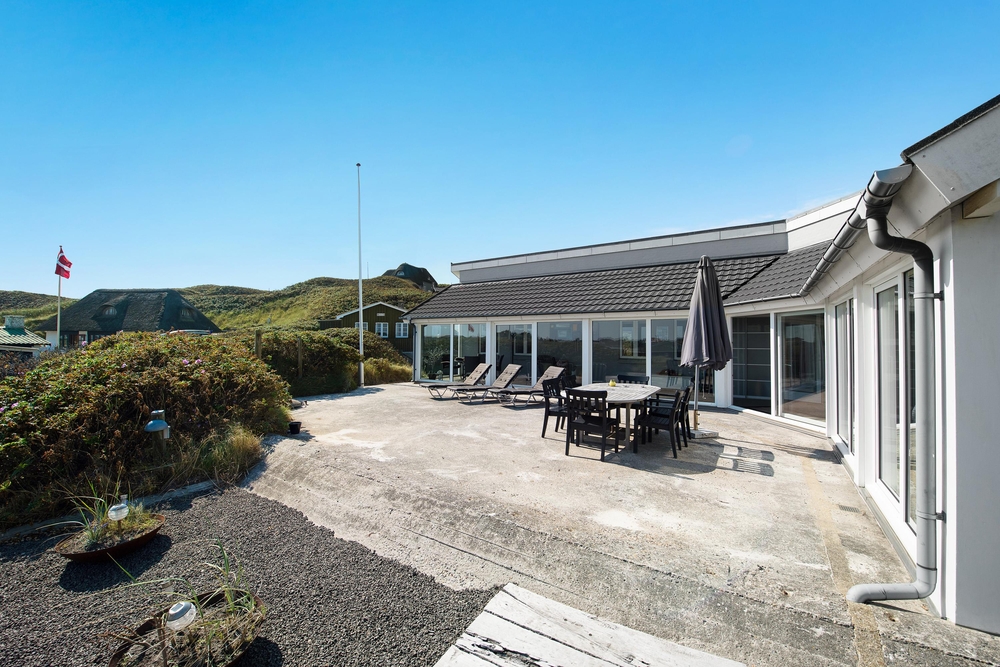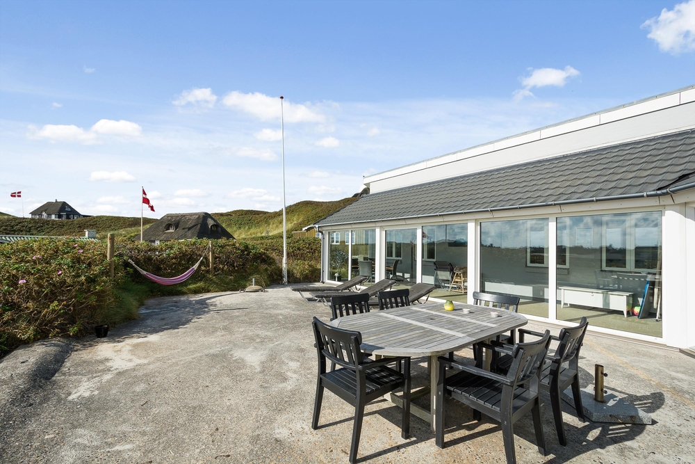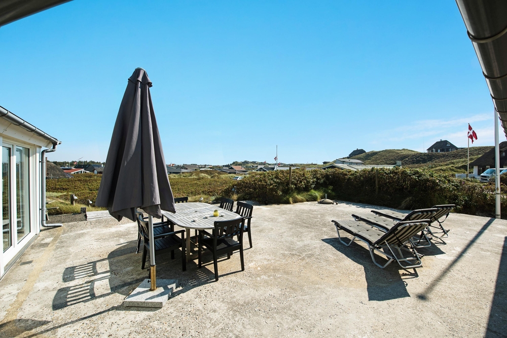 Feriehuset har to dejlige terasser mod nord/øst og syd/vest. Fra terrasserne kan I følge solens gang hele dagen. Ydermere kan I læne jer tilbage i de tilhørende havemøbler og liggestole til sommerhuset samtidig med, at andre står for tilberedning af et lækkert måltid på grillen. Sommerhuset ligger blot et stenkast fra det storslåede Vesterhav og populære badestrand.