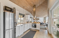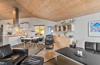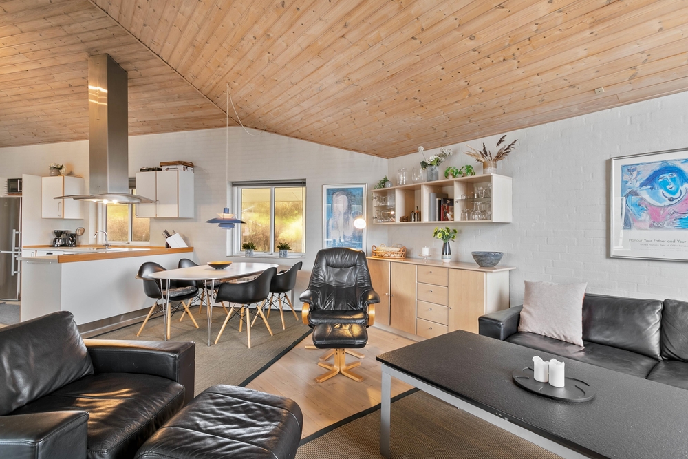 Feriehusets åbne køkken ligger i forlængelse med stuen, så I her har mulighed for enten at samles om madlavningen eller planlægge ugens oplevelser og aktiviteter. I har desuden også mulighed for at smide jer i sofaen med en god bog, en god film eller spille et spil sammen, imens I nyder varmen fra feriehusets brændeovn.