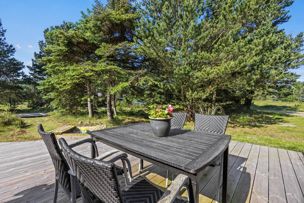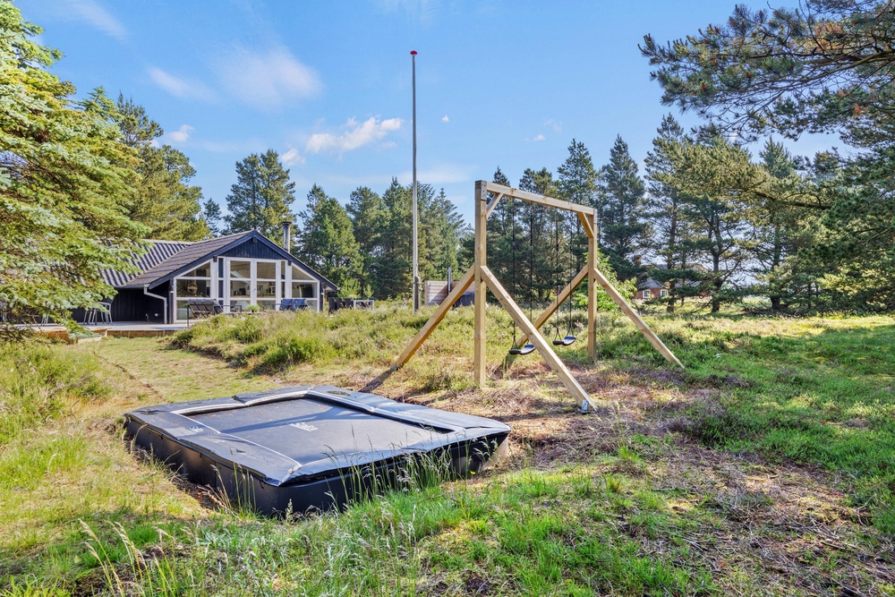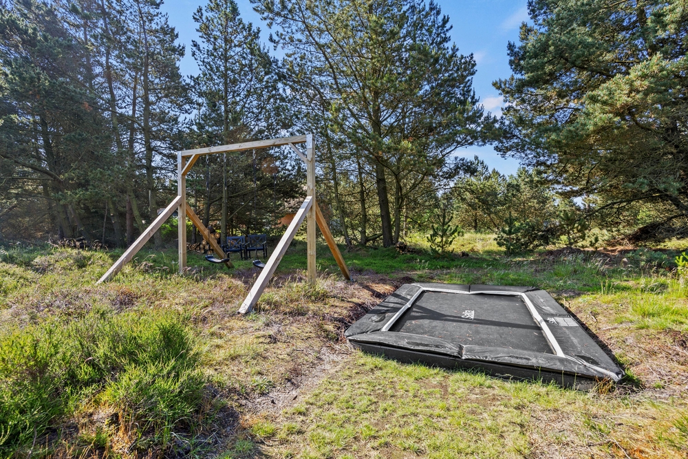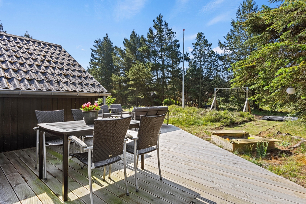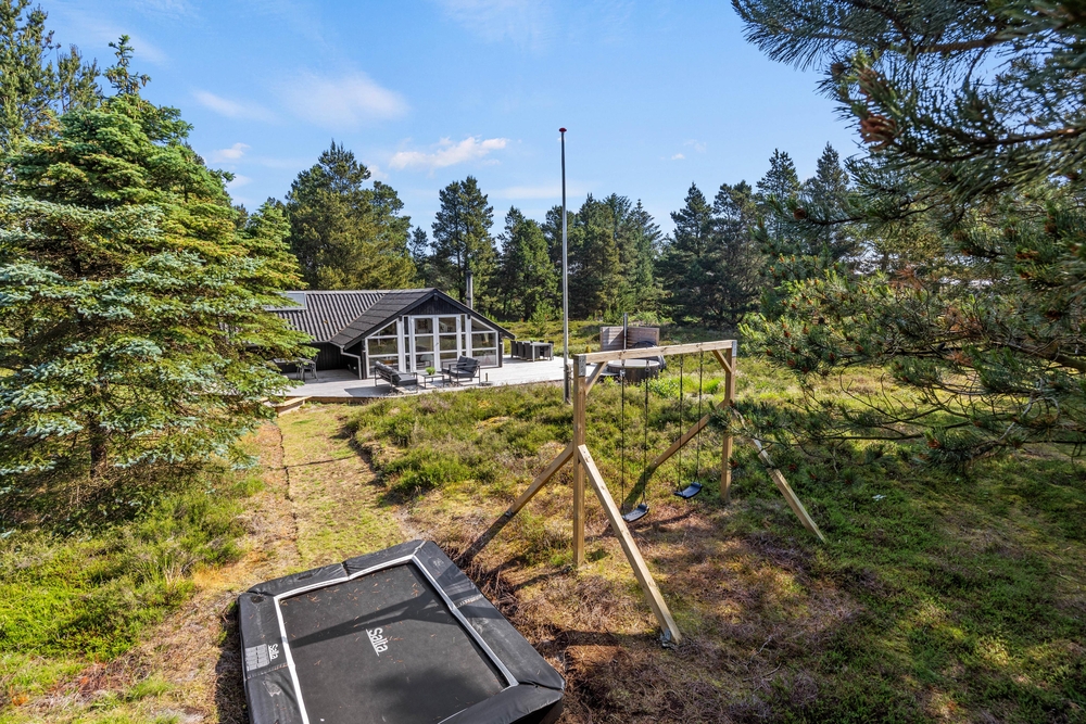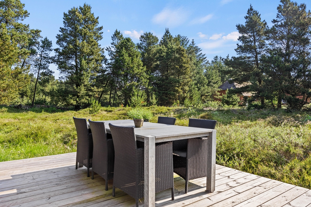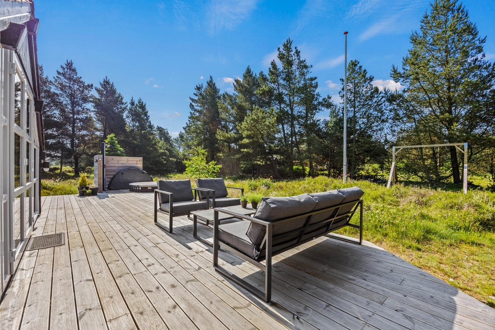 På den smukke brede træterrasse, som omgiver feriehuset, kan I tage solbad i havemøblerne eller trække jer tilbage i skyggen, hvis solen bliver for stærk. Her er mange kroge, så man kan altid finde sig en god plet, hvor man kan trække sig tilbage med sin yndlingsroman. Udsigten over den lyngklædte naturgrund er helt unik, og I kan nyde den samtidig med, at I holder øje med børnenes leg i sandkassen, gyngerne og på trampolinen. Det samme kan I fra vildmarksbadet ? eller I kan benytte det i aftentimerne og nyde freden under stjernehimlen.