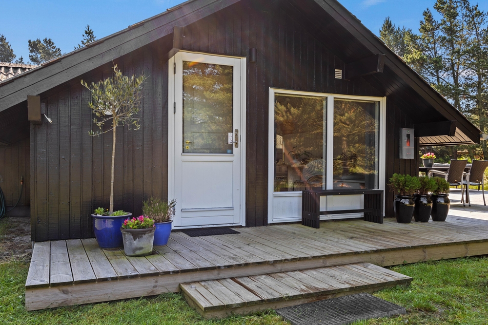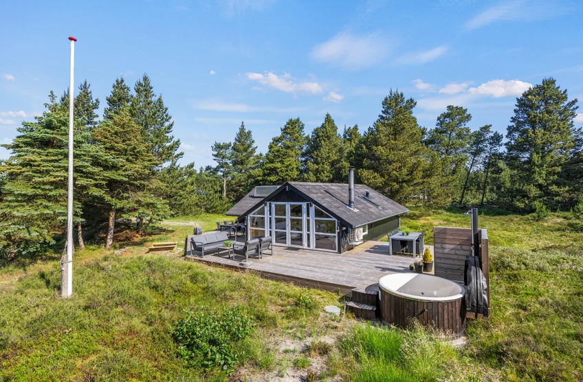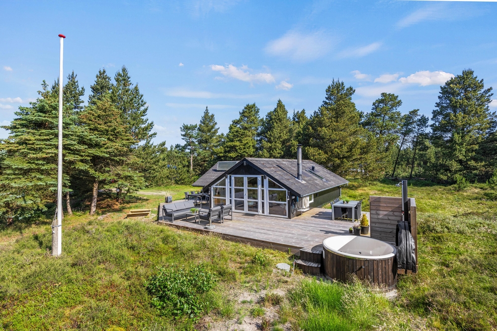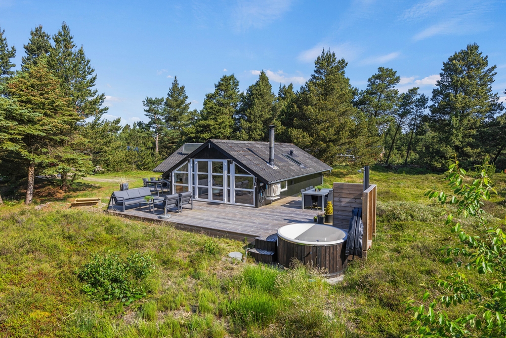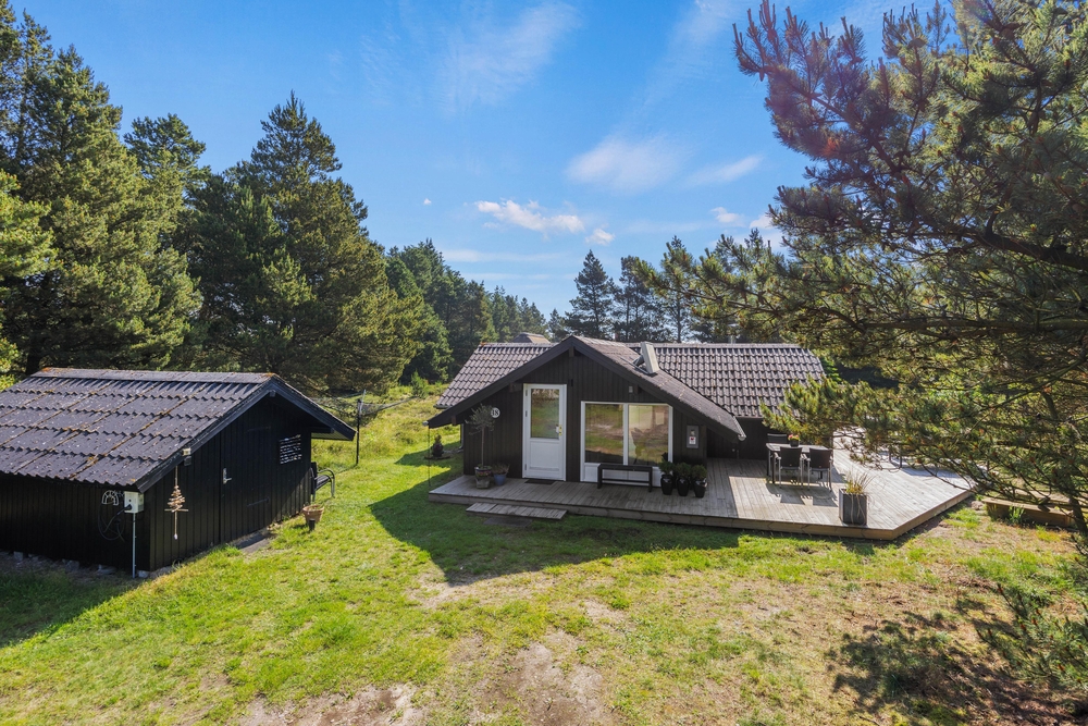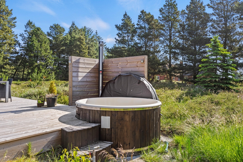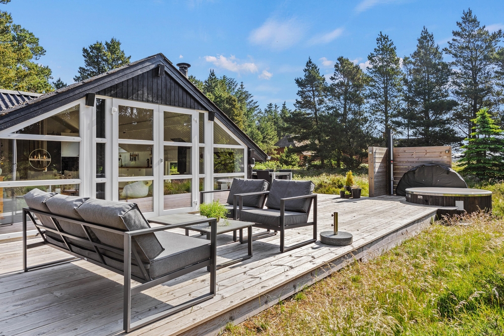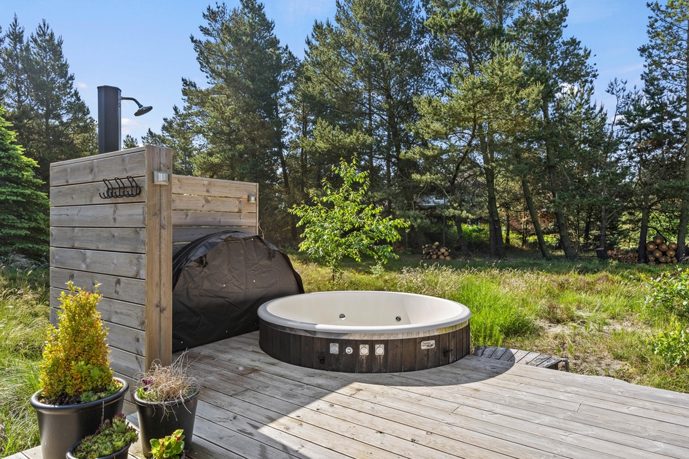 På den smukke brede træterrasse, som omgiver feriehuset, kan I tage solbad i havemøblerne eller trække jer tilbage i skyggen, hvis solen bliver for stærk. Her er mange kroge, så man kan altid finde sig en god plet, hvor man kan trække sig tilbage med sin yndlingsroman. Udsigten over den lyngklædte naturgrund er helt unik, og I kan nyde den samtidig med, at I holder øje med børnenes leg i sandkassen, gyngerne og på trampolinen. Det samme kan I fra vildmarksbadet ? eller I kan benytte det i aftentimerne og nyde freden under stjernehimlen.