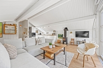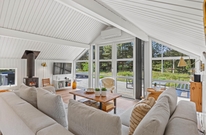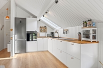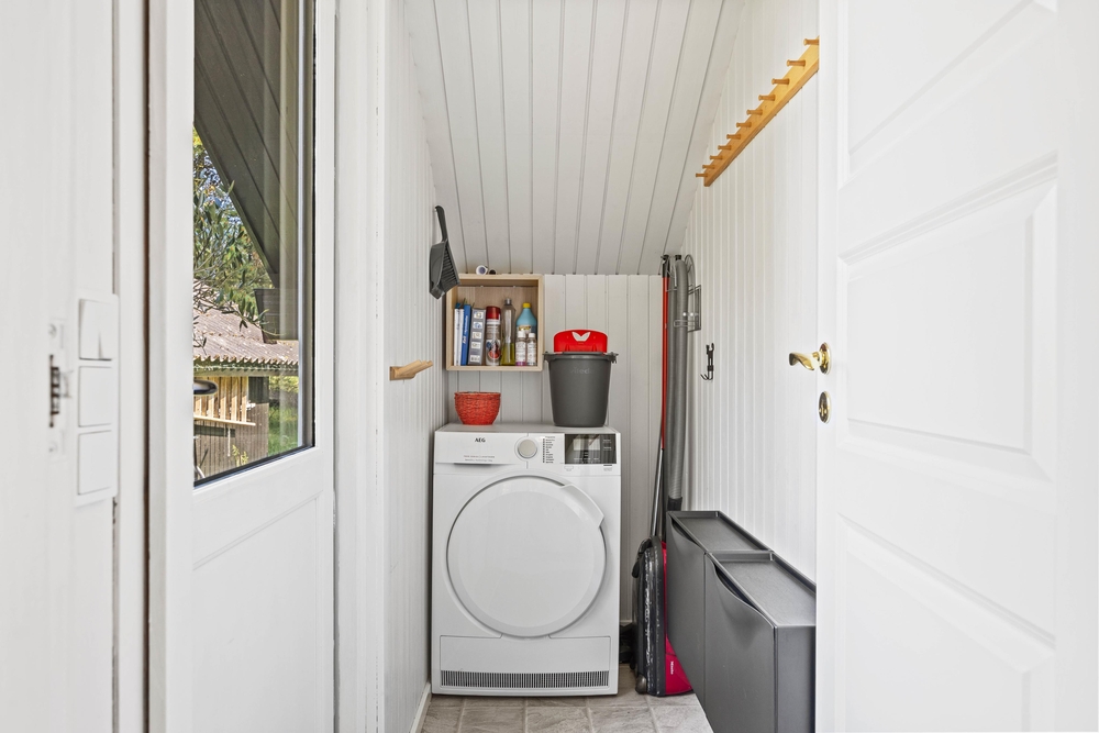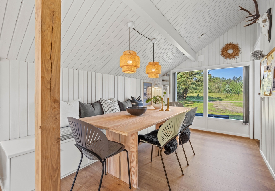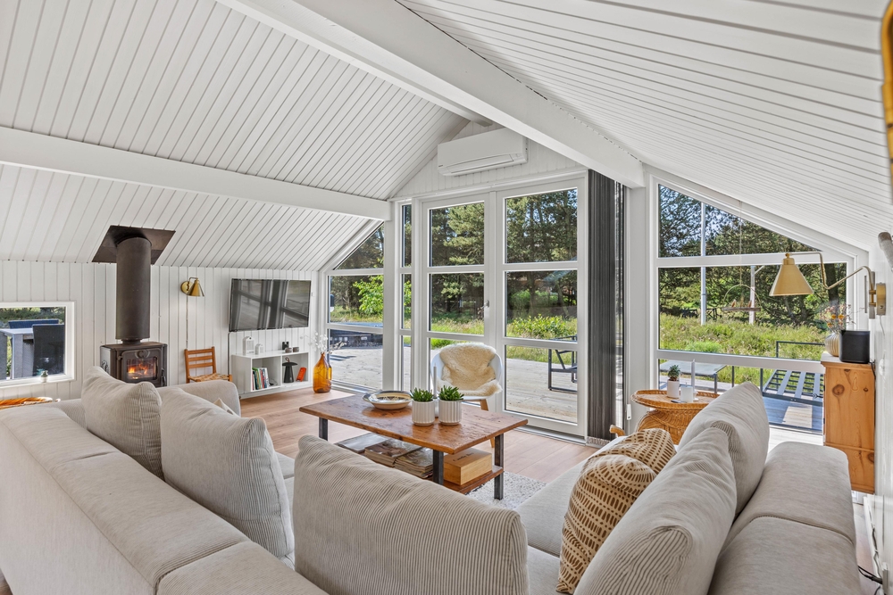 Feriestemningen melder sig straks, man træder ind ad døren til Småfolksvej 18. De lyse, træbeklædte vægge og gulve giver et dejlig let miljø, og med ild i brændeovnen kan man slappe af i sofaen og mærke fred og ro folde sig ud i rummet. Den omkostnings- og energibesparende varmepumpe sørger for behagelige temperaturer i feriehuset. Det veludstyrede køkken indeholder alt, hvad I har brug for, når I vil forkæle hinanden med lækre hjemmelavede måltider, herunder opvaskemaskine, mikrobølgeovn og en 114 liters separat fryser.