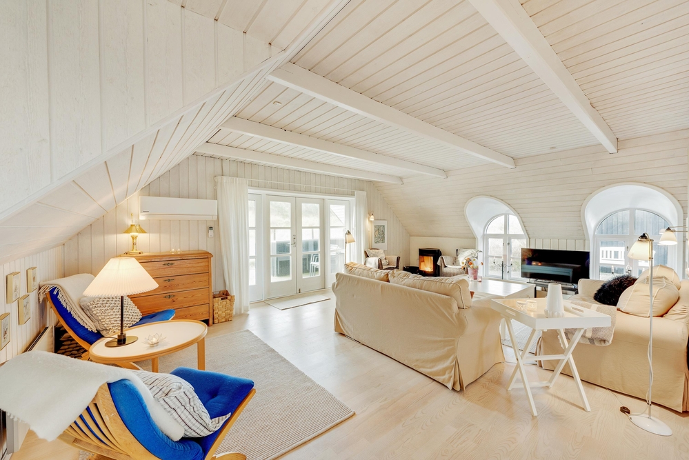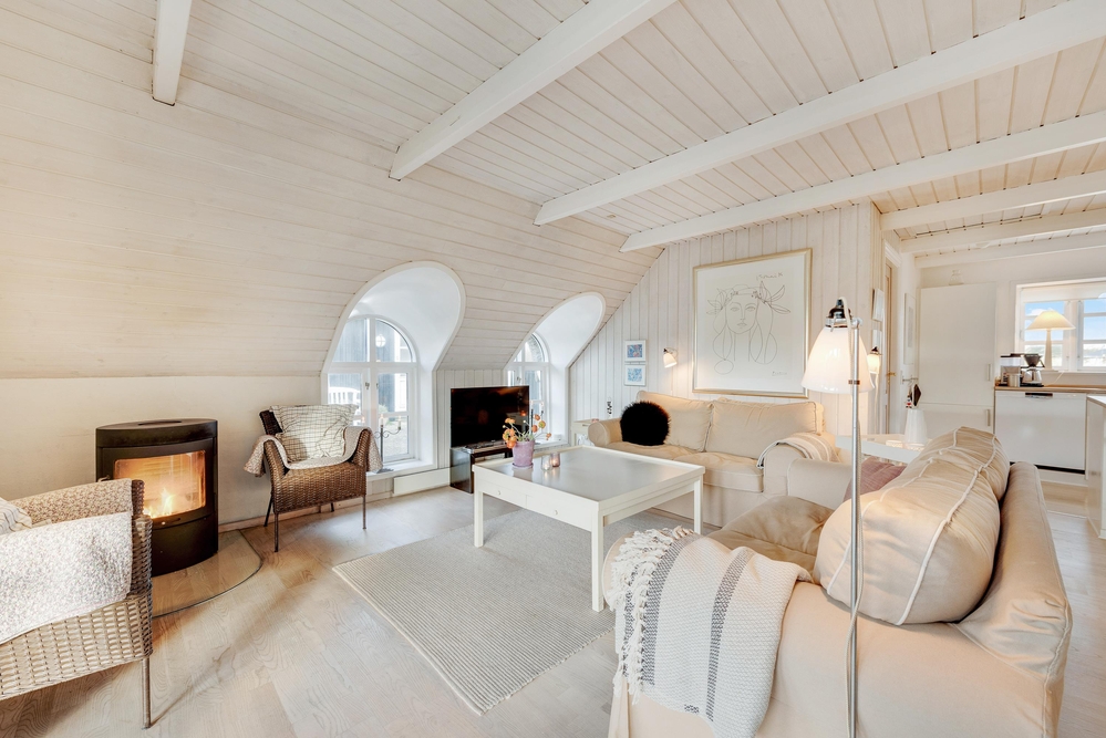 Det stråtækte sommerhus på Sneppedalen 35 kan huse op til 8 personer. Det store åbne opholdsrum er der hvor I både finder køkken, spisestue og selve stuen, og de er alle indrettet med henblik på, at I skal kunne hygge jer og slappe af. Stuen er med hyggelige sofaer og fra sofahjørnet kan I se alle jeres yndlingsfilm på sommerhusets store fladskærmstv som er udstyret med en chromecast. Flammerne i brændeovnen kan også give jer en behagelig og endnu mere hyggelig stemning i sommerhuset. Det åbne køkken og spisestue sørger for, at alle kan hygge sig og snakke sammen, også under madlavningen og mens opvaskemaskinen fyldes efter maden.